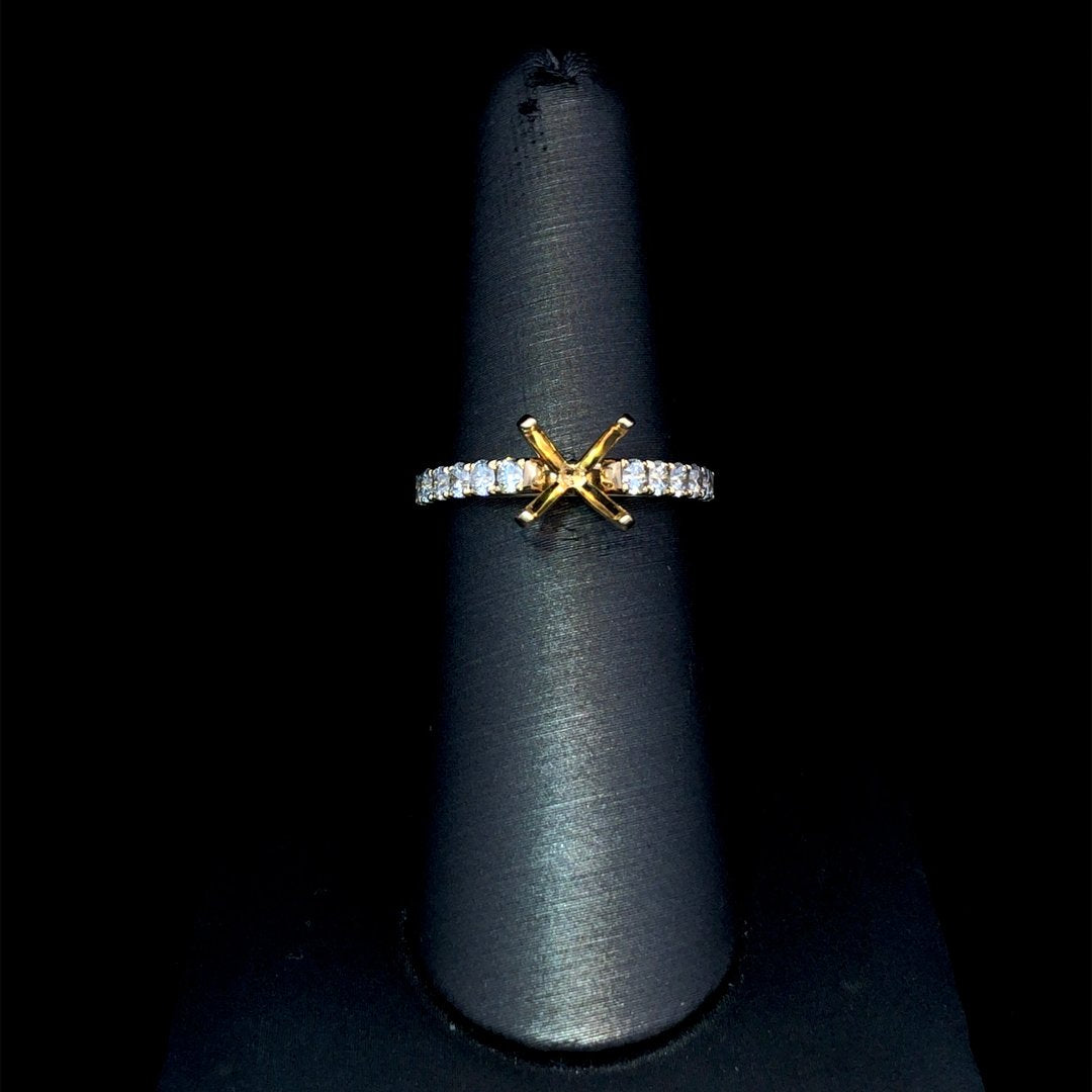Create your dream ring with our classic diamond semi mount, designed with a cathedral style band in 18 kt yellow gold and .63 ctw of round diamonds. Choose your perfect center stone from our unmatched selection of loose stones and add a personal touch to this beautiful piece. Price is for the semi mount only. Center stone will be added at an additional cost. This ring is a size 6.25. If that size is not a perfect fit, first time sizing is free at the time of purchase. Additional sizing fees may apply.