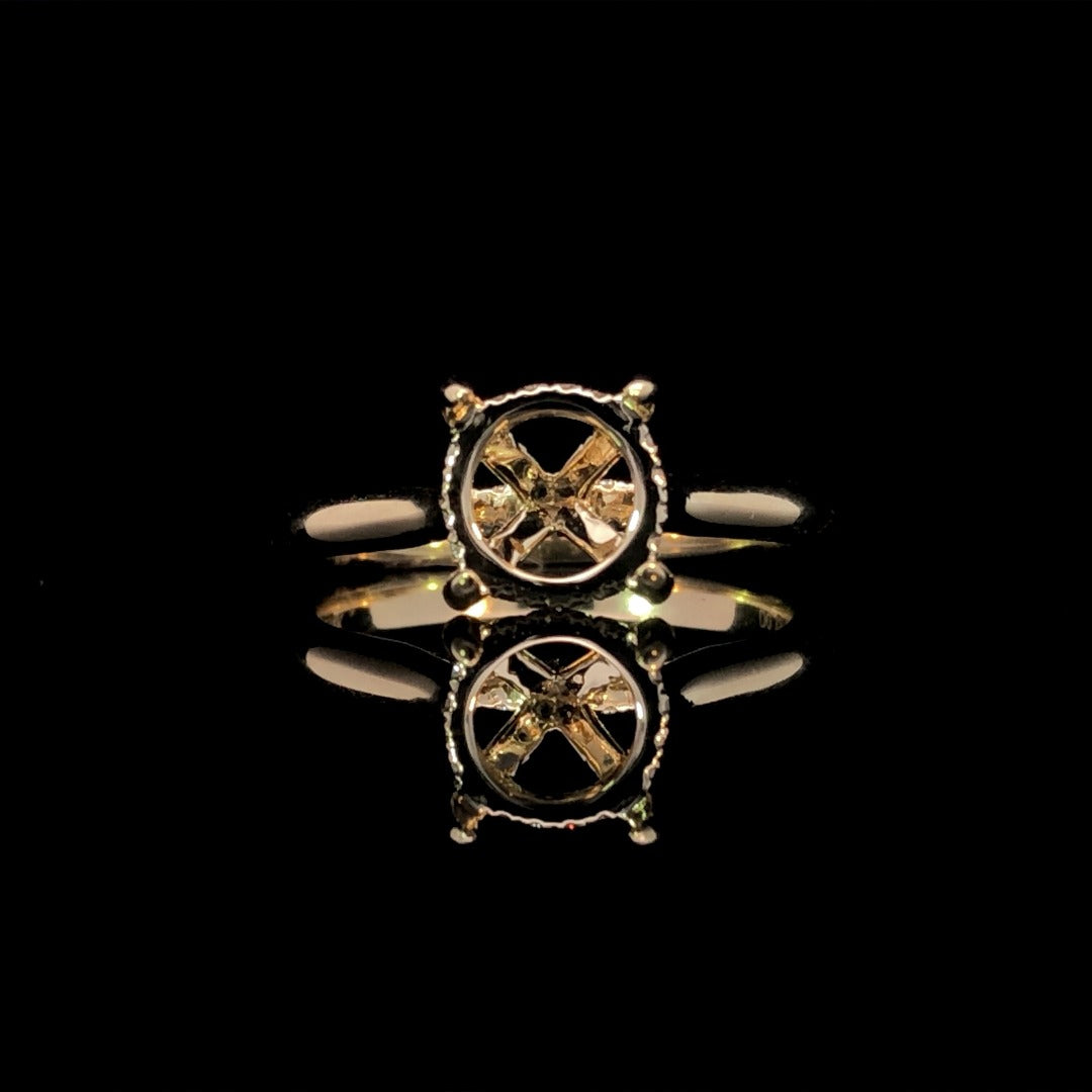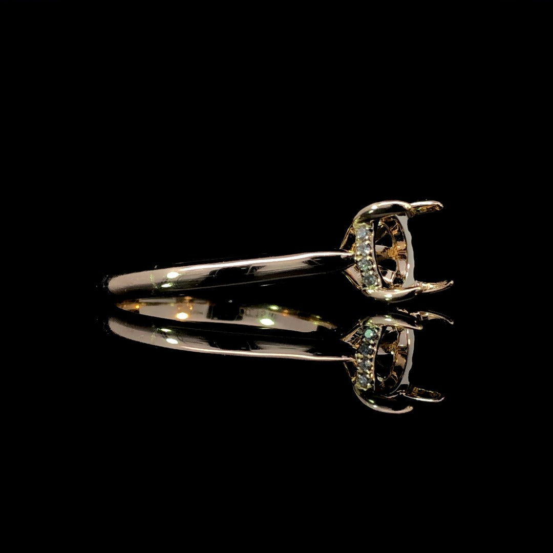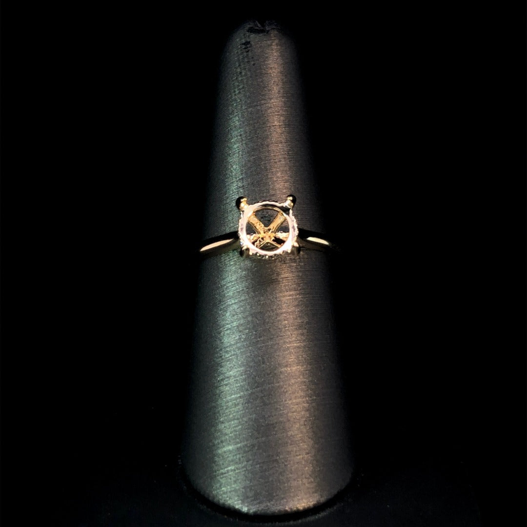 Create your dream ring with this beautiful semi mount. Choose from our wide range of loose stones to create a stunning centerpiece, framed by a hidden halo. Additional round diamonds add extra sparkle to the 14kt yellow gold cathedral band. Make a statement with this unique and elegant piece. Price is for the semi mount only. Center stone will be added at an additional cost. This ring is a size 7. If that size is not a perfect fit, first time sizing is free at the time of purchase. Additional sizing fees may apply.