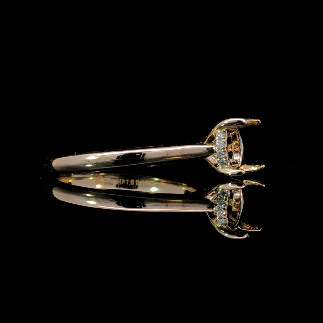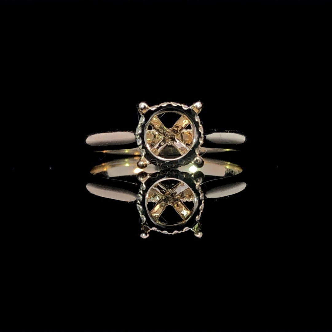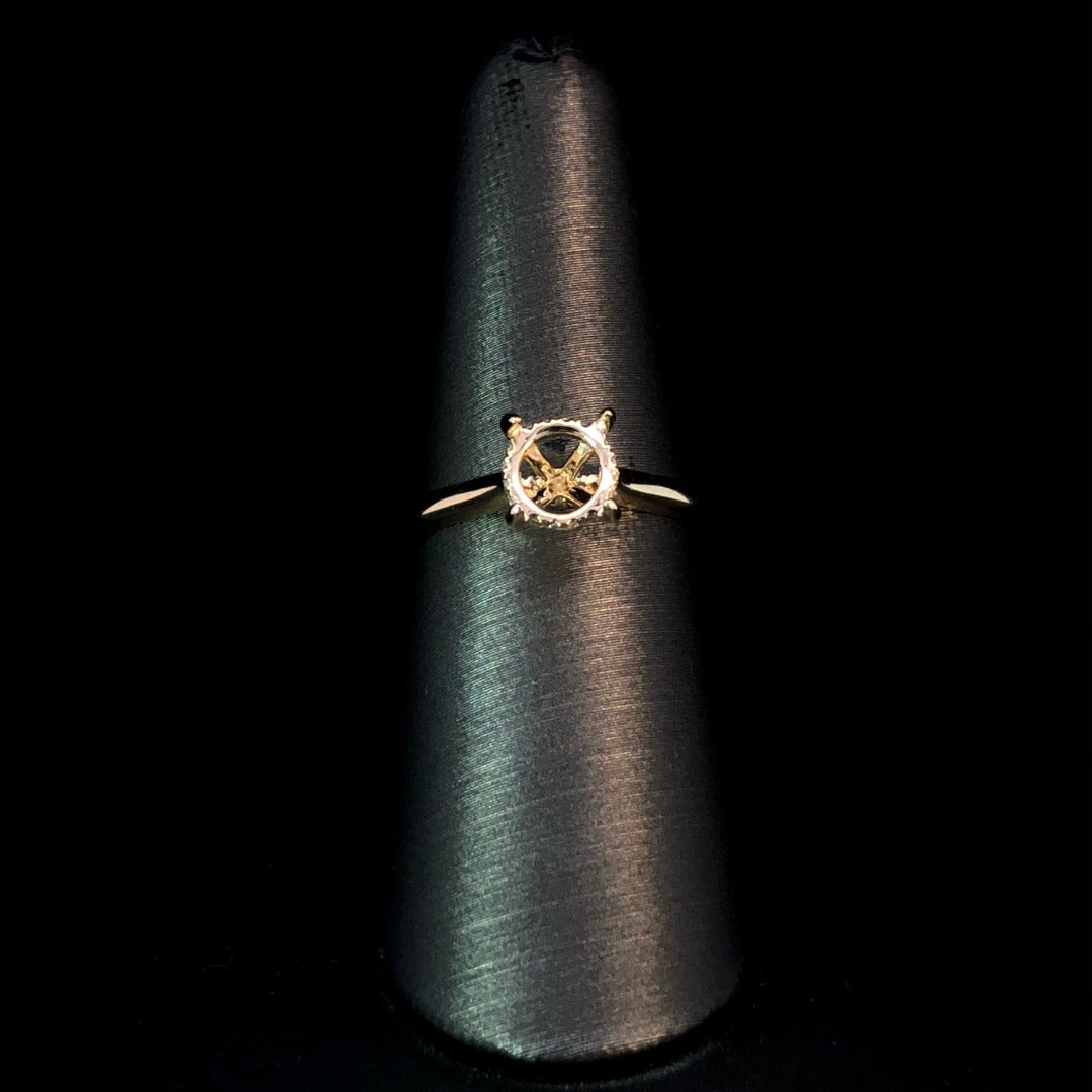 Create your perfect ring with this chic semi mount, featuring a hidden halo and extra diamond accents totaling .14ctw. Crafted in 14kt yellow gold, simply add your choice of round center stone from our selection of loose stones to complete this stunning piece. Price is for the semi mount only. Center stone will be added at an additional cost. This ring is a size 7. If that size is not a perfect fit, first time sizing is free at the time of purchase. Additional sizing fees may apply.