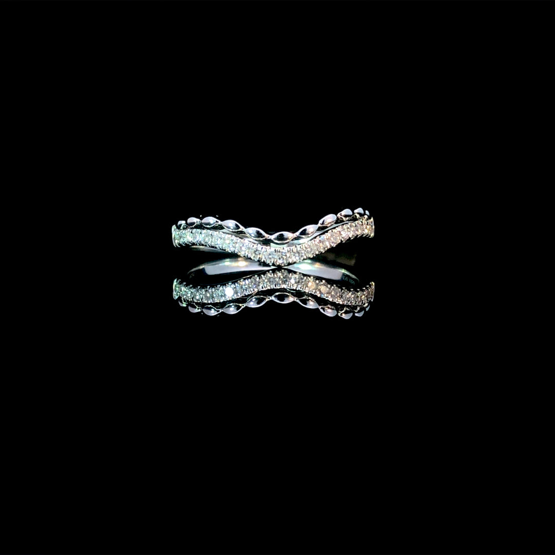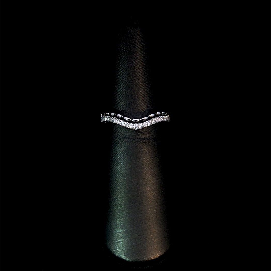 Elevate your style with this curved diamond band. Featuring a unique design, this band showcases a row of round diamonds totaling .16ctw, accented by 14kt white gold beads. Express your individuality and add a touch of elegance to any outfit. This ring is a size 6. If that size is not a perfect fit, first time sizing is free at the time of purchase. Additional sizing fees may apply.
