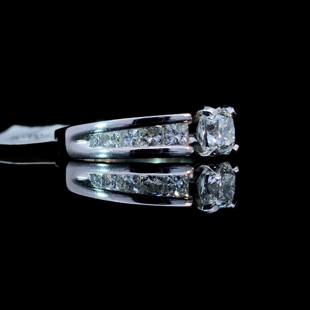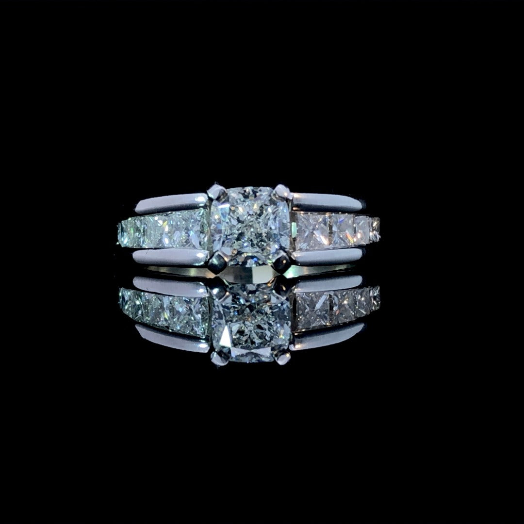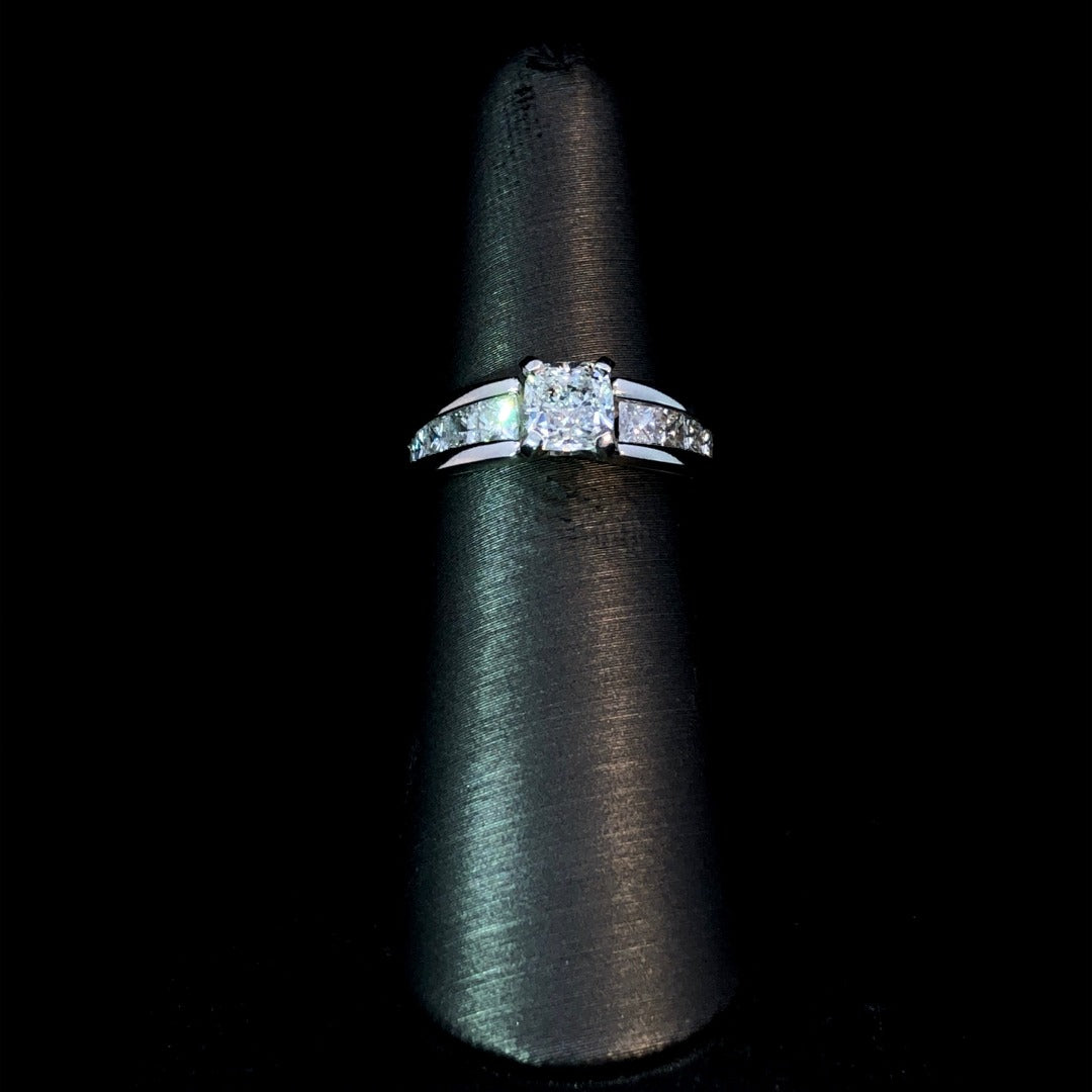 Elevate any outfit with our exclusive ring. Boasting a gorgeous 1.05ct cushion cut diamond, this platinum beauty is adorned with .50ctw of channel-set diamond accents for a total weight of 1.55ctw. Make a statement with this luxurious and sophisticated piece. This ring is a size 6. If that size is not a perfect fit, first time sizing is free at the time of purchase. Additional sizing fees may apply.