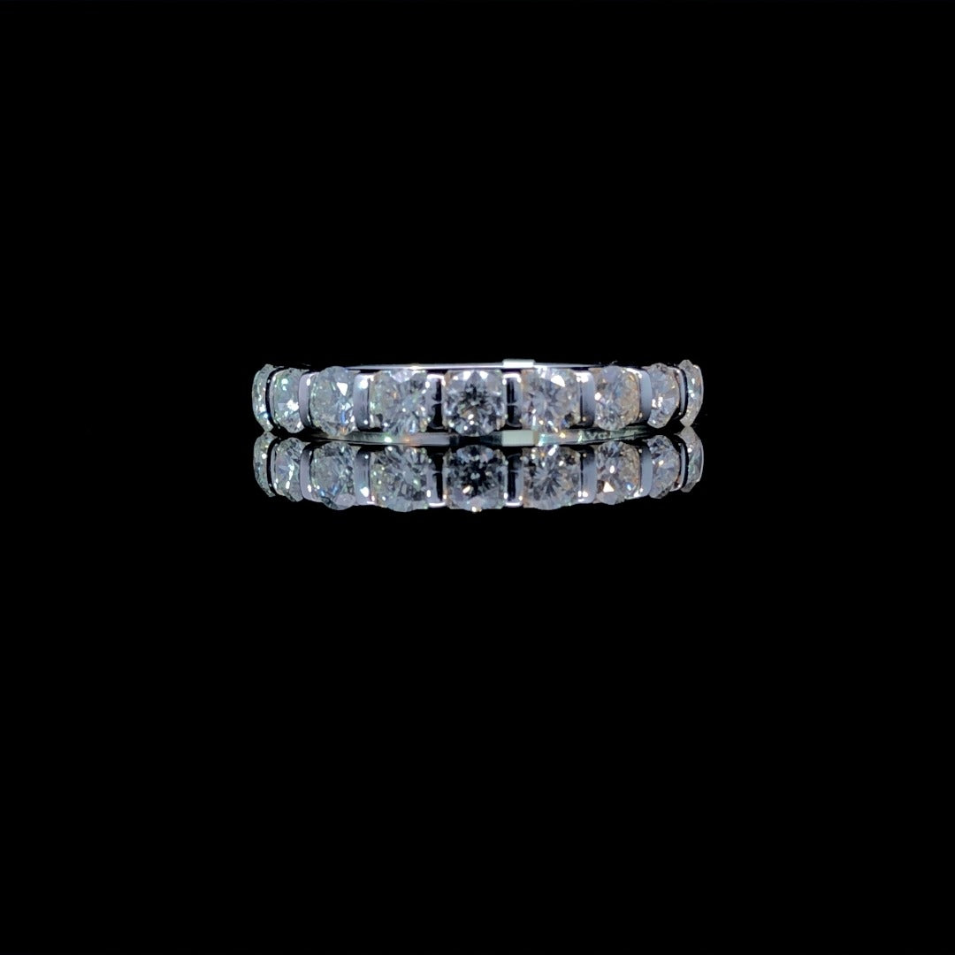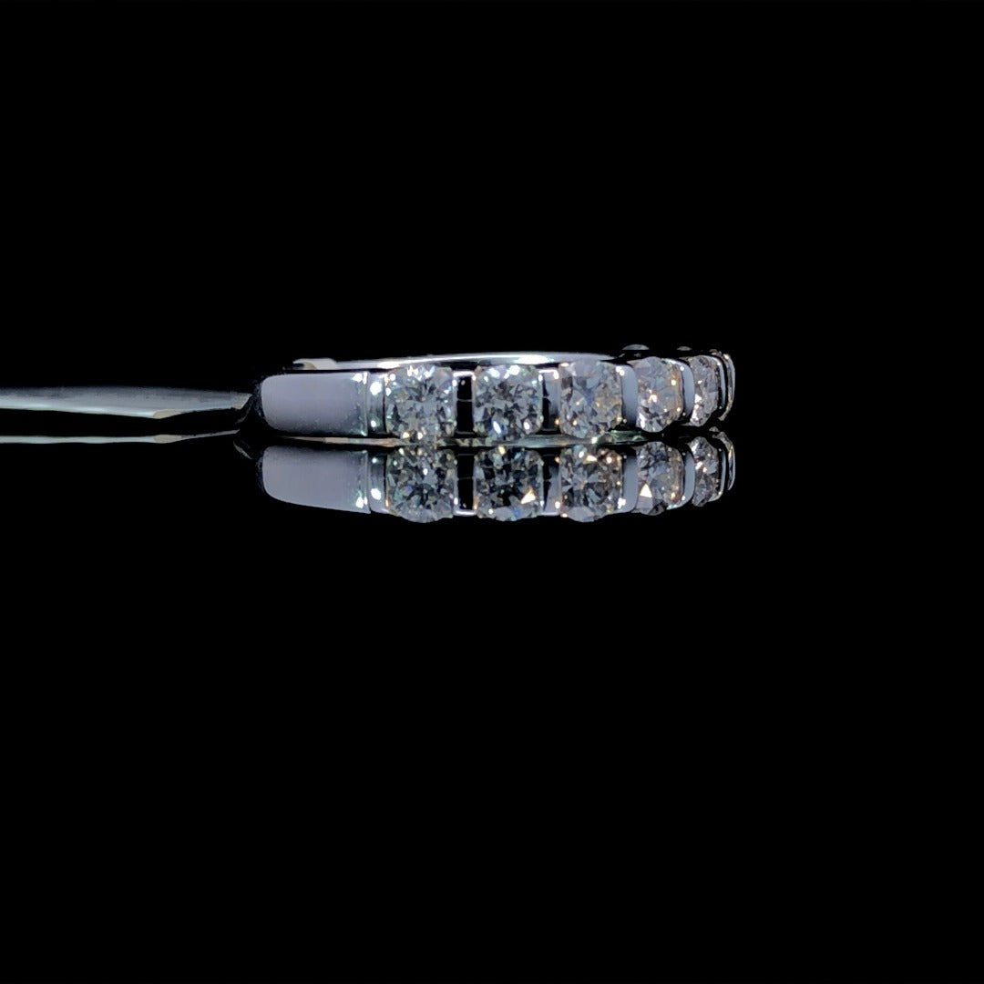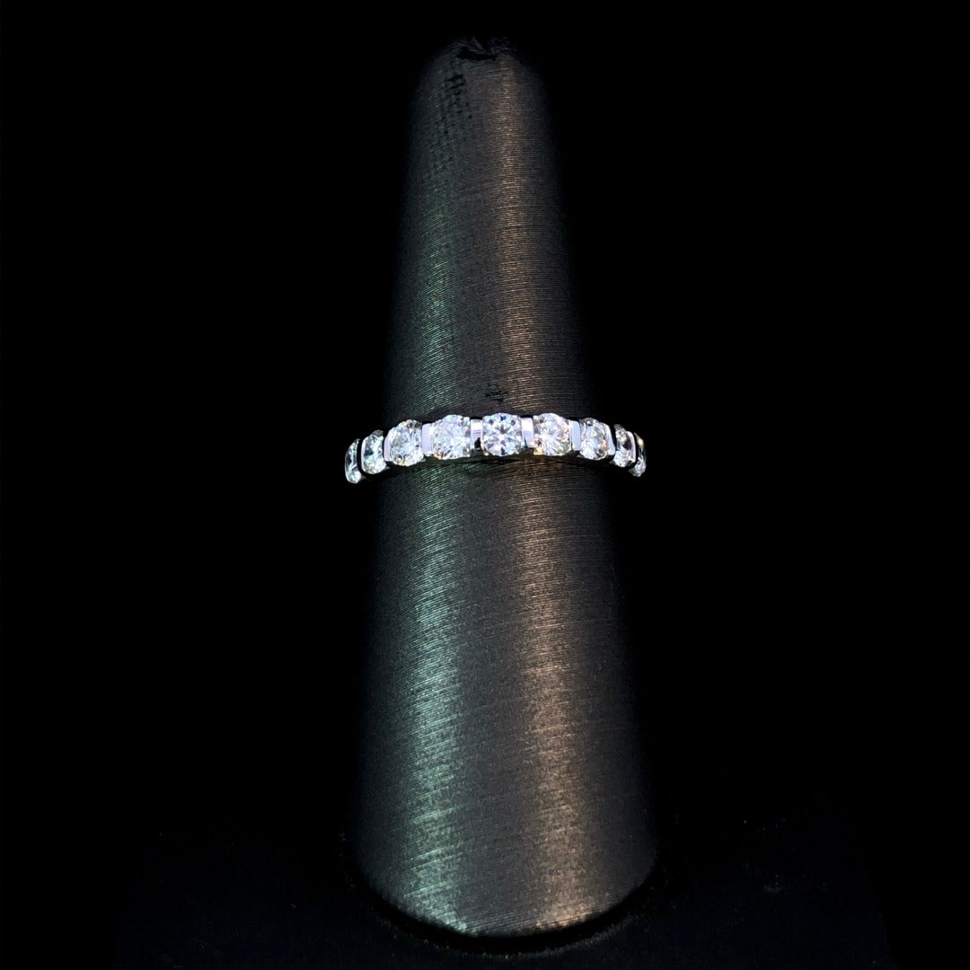 Celebrate your love with this anniversary band! This elegant piece features 1.00ctw of sparkling round diamonds, skillfully bar set in luxurious 14kt white gold. Show your eternal commitment with this timeless classic. This ring is a size 7. If that size is not a perfect fit, first time sizing is free at the time of purchase. Additional sizing fees may apply.