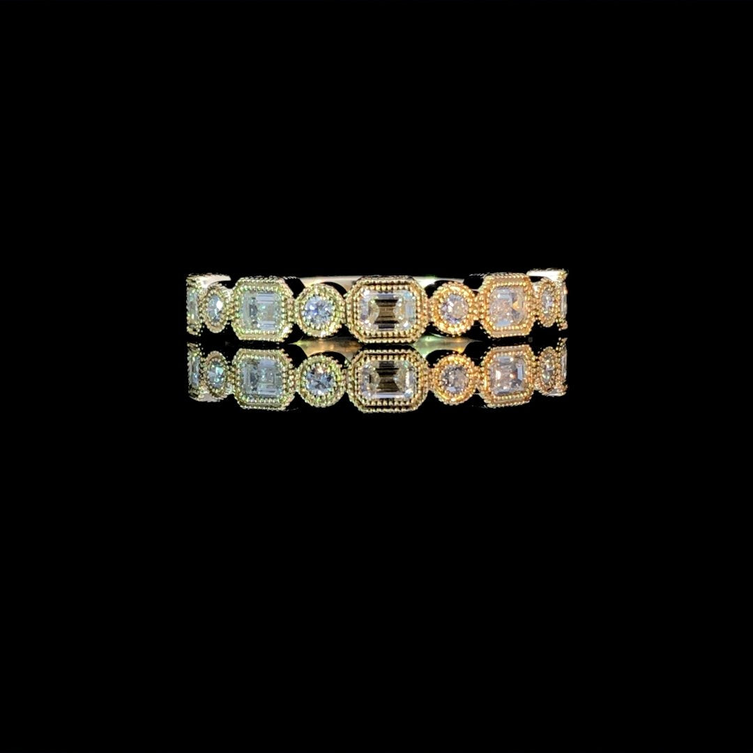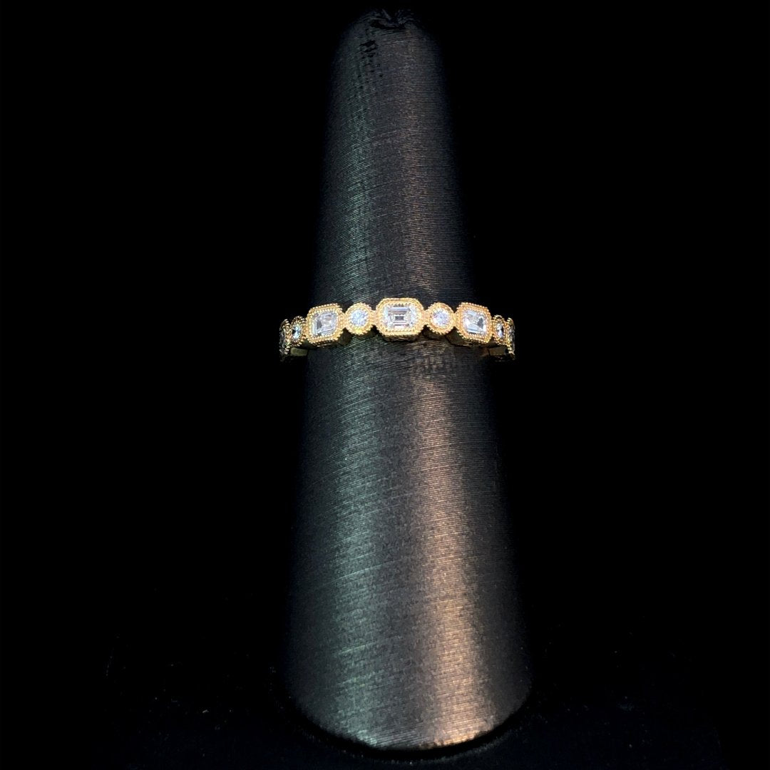 Indulge in the exquisite beauty of this stunning anniversary band. It boasts .90ctw of round and baguette diamonds, elegantly bezel set in luxurious 14kt yellow gold. With intricate milgrain detailing, this band is perfect for stacking and adding a touch of sophistication to any look. This ring is a size 6.5. If that size is not a perfect fit, first time sizing is free at the time of purchase. Additional sizing fees may apply.