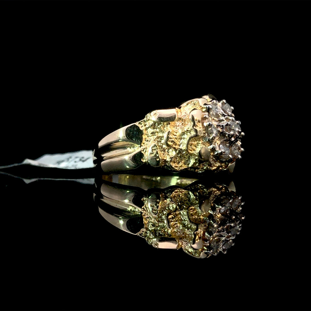 Discover the perfect blend of style and luxury with this men's nugget ring. Made with 10kt yellow gold, it boasts a sparkling cluster of .42ctw of round diamonds at its center. Elevate your look with this stunning ring. This ring is a size 9.75. If that size is not a perfect fit, first time sizing is free at the time of purchase. Additional sizing fees may apply.