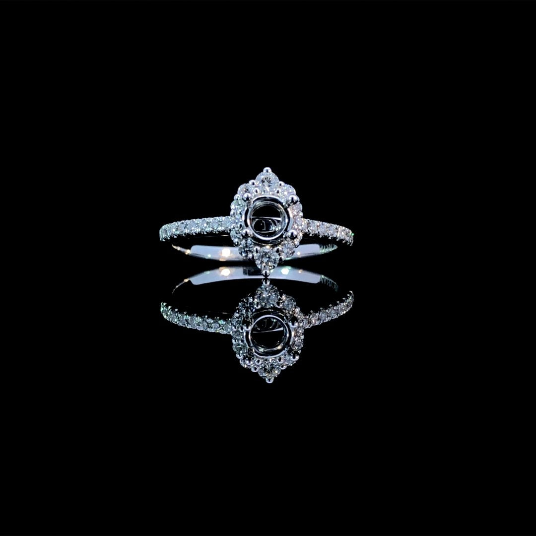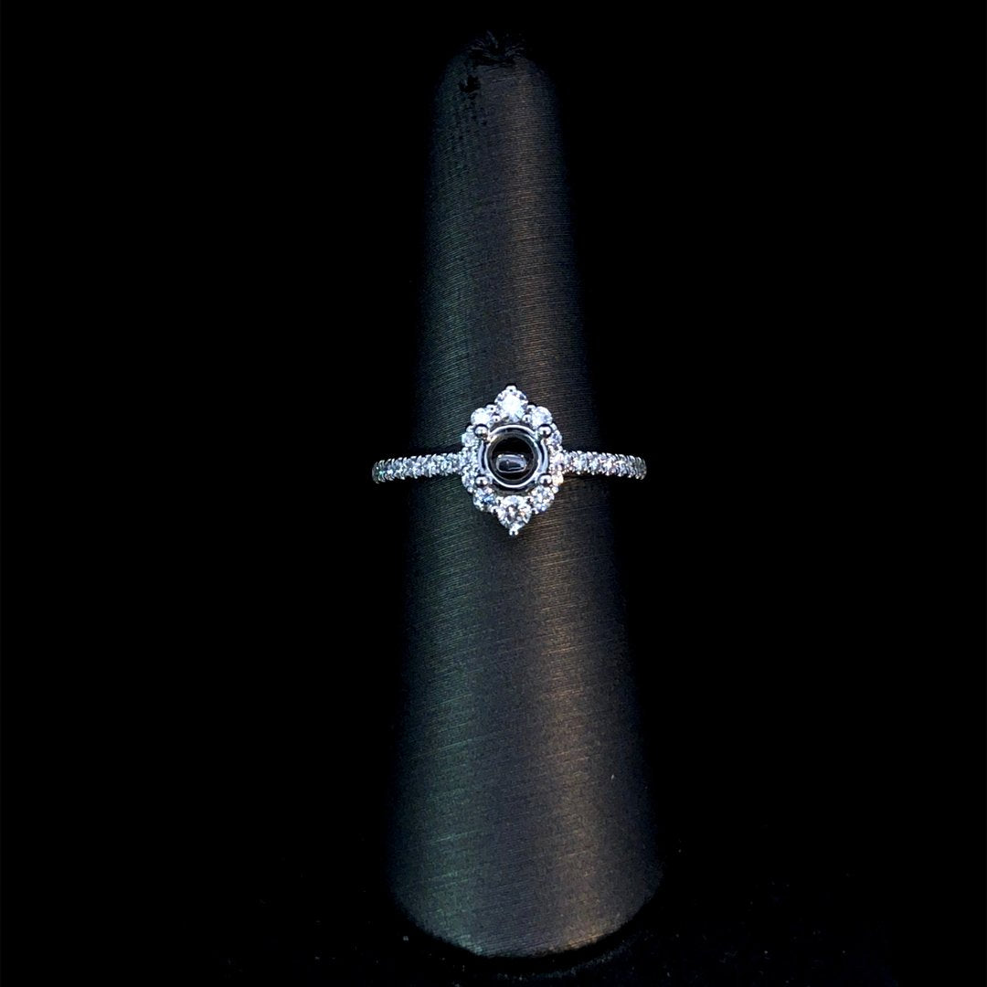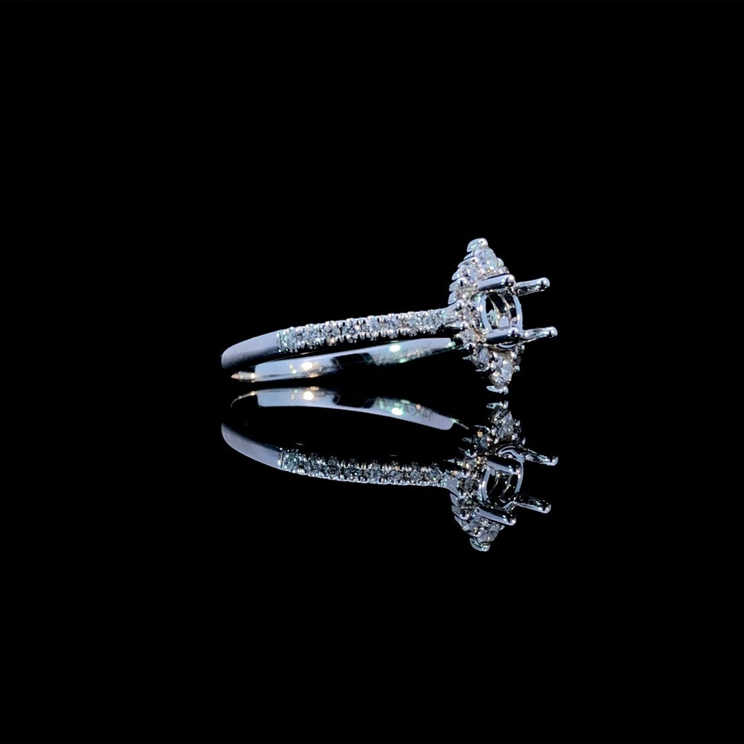 This diamond semi mount is a show-stopping piece, featuring a unique design with a decorative halo and diamonds down the band. Crafted in 14kt white gold with .33ctw of round diamonds, this stunning ring is the perfect choice for creating a personalized engagement ring with your choice of center stone. Price is for the semi mount only. Center stone will be added at an additional cost. This ring is a size 7. If that size is not a perfect fit, first time sizing is free at the time of purchase. Additional sizing fees may apply.