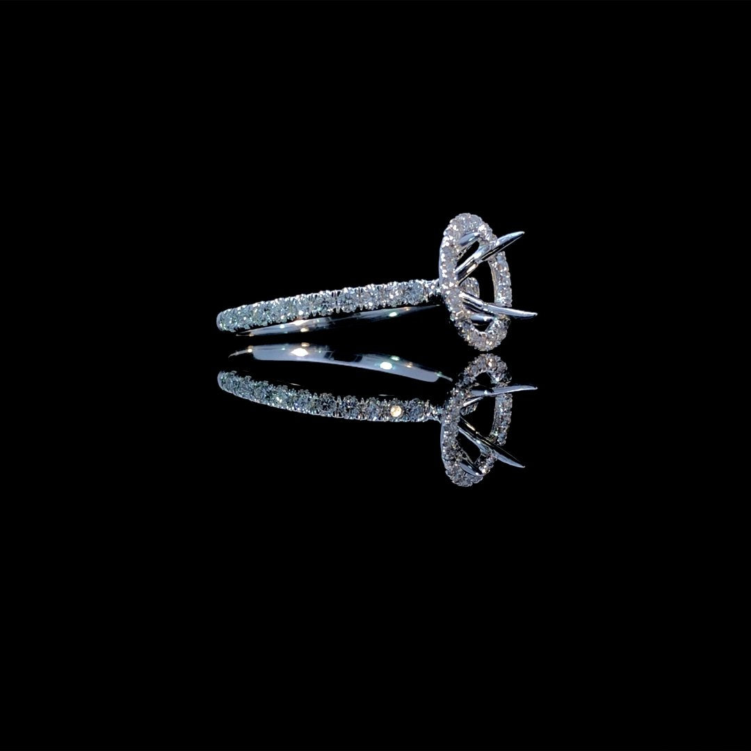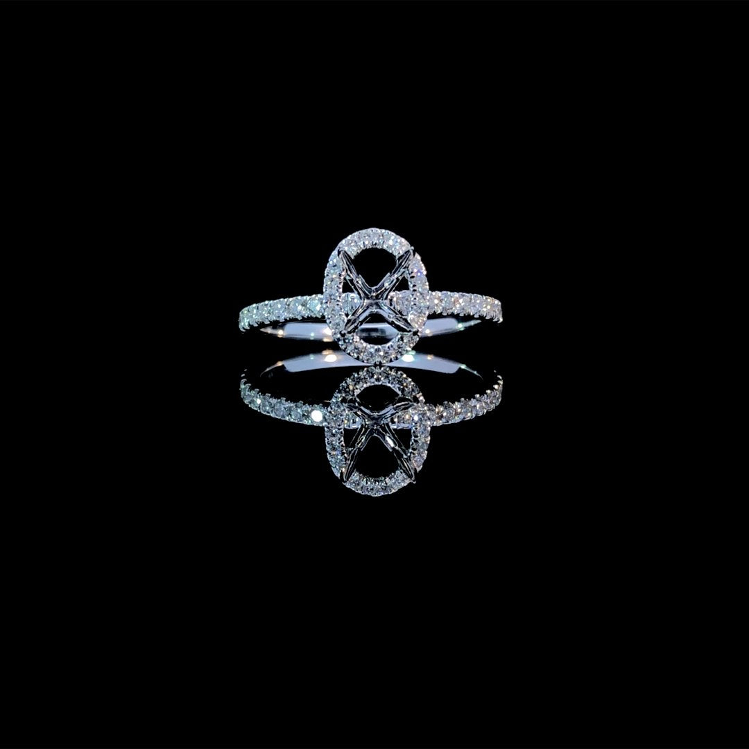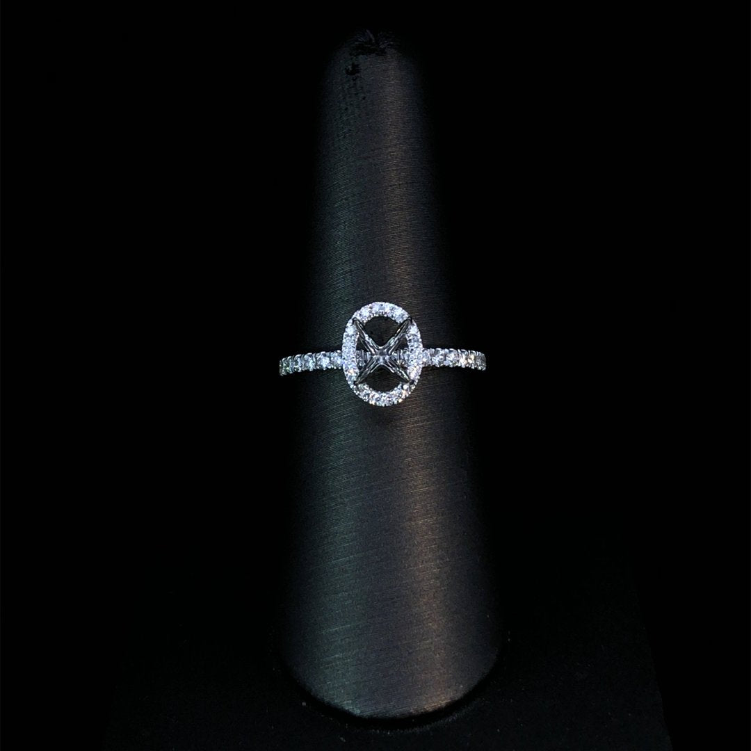 Create your dream ring with this beautiful diamond semi mount. Featuring a stunning oval shaped halo and diamonds along the band, this 14kt white gold setting has a total diamond weight of .40ctw of round diamonds. Make the center stone of your dreams shine with this classic, elegant design. Price is for the semi mount only. Center stone will be added at an additional cost. This ring is a size 7. If that size is not a perfect fit, first time sizing is free at the time of purchase. Additional sizing fees may apply.