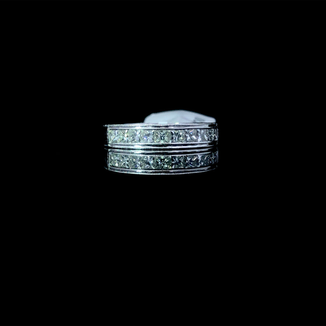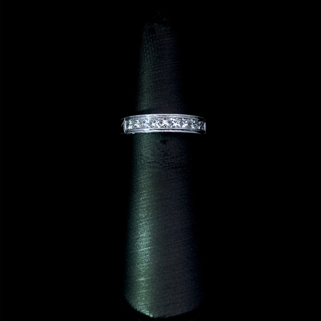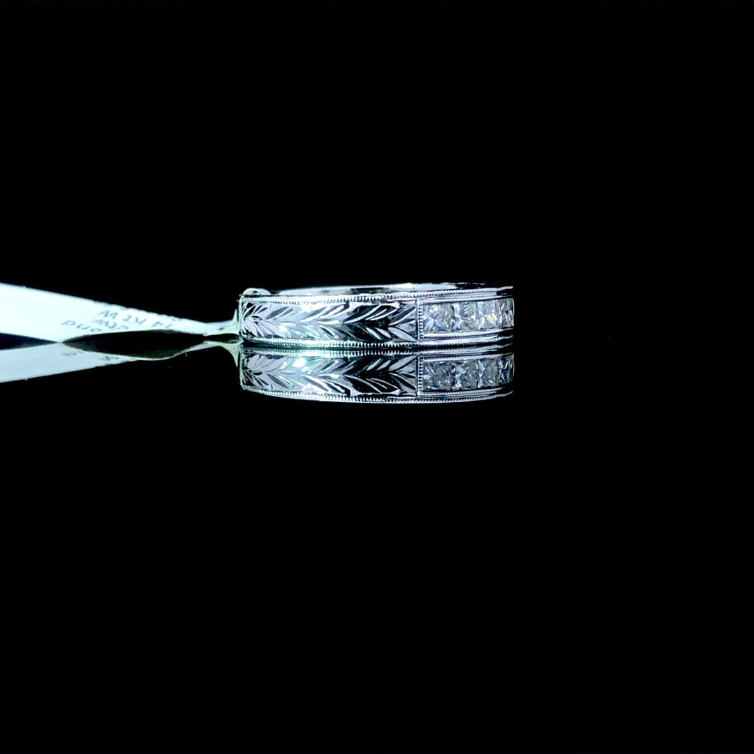 Elevate your jewelry collection with this stunning diamond band. Featuring .71ctw of princess cut diamonds elegantly channel set in 14kt white gold and adorned with intricate engravings. A perfect piece to add a touch of sophistication to any outfit. This ring is a size 5.5. If that size is not a perfect fit, first time sizing is free at the time of purchase. Additional sizing fees may apply.