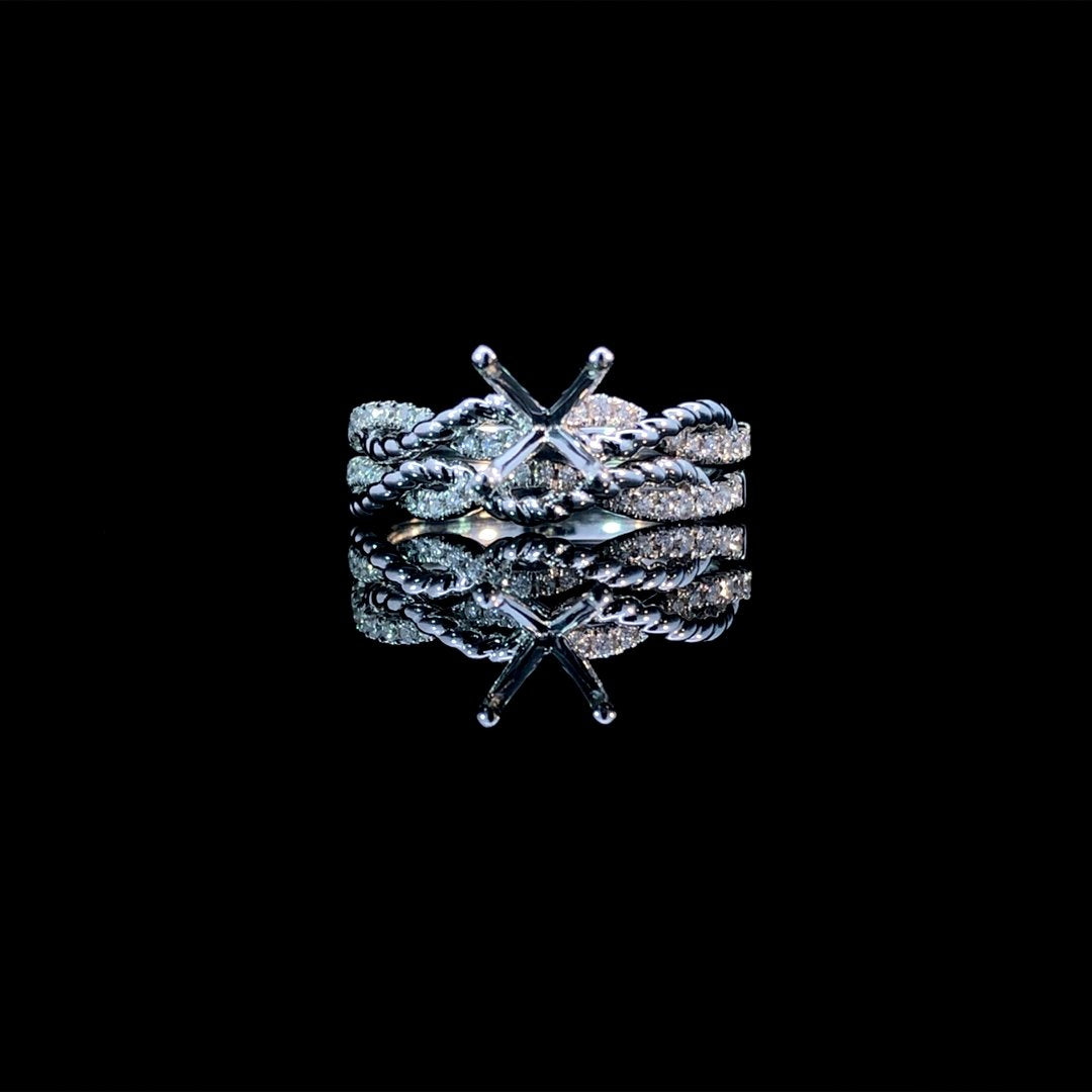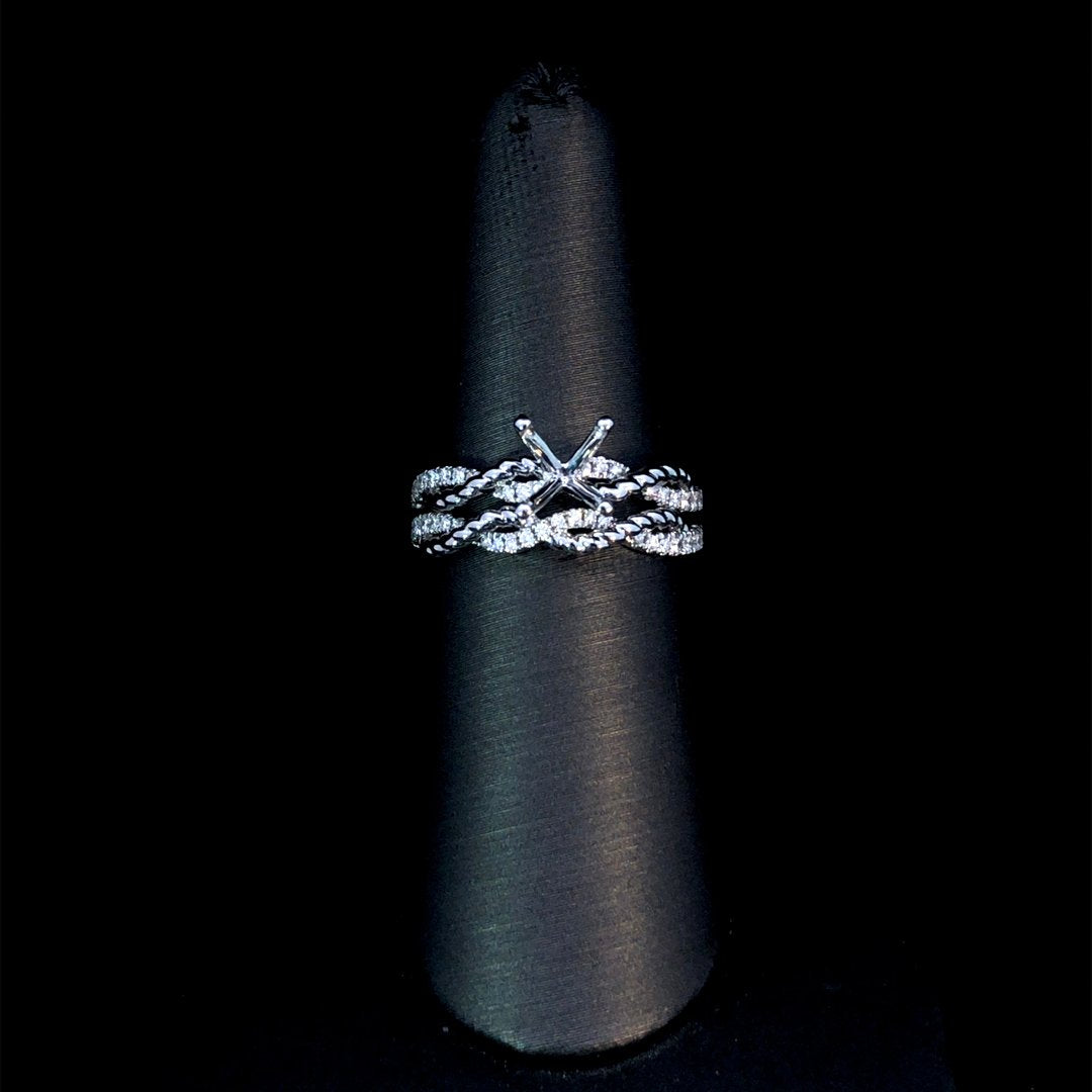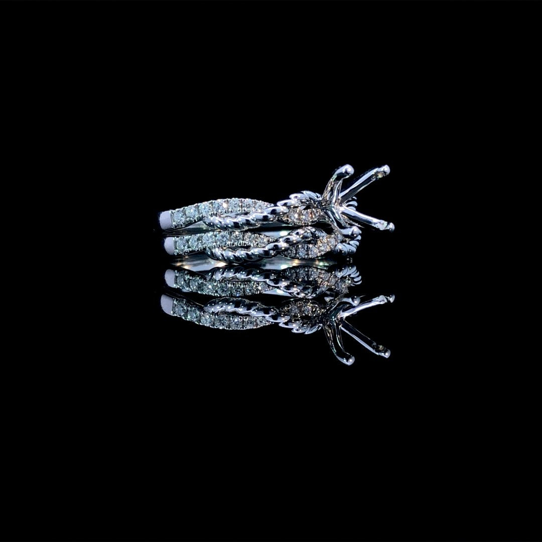 Elevate your center stone with this exquisite diamond semi mount. Our 14kt white gold setting boasts a .15ctw band of round diamonds, elegantly twisted with a rope-style design. Choose from our collection to truly personalize your one-of-a-kind piece. Pair it with the matching band (sold separately) for a complete, unique set. Price is for the semi mount only. Center stone and band will be added at an additional cost. This ring is a size 7. If that size is not a perfect fit, first time sizing is free at the time of purchase. Additional sizing fees may apply.