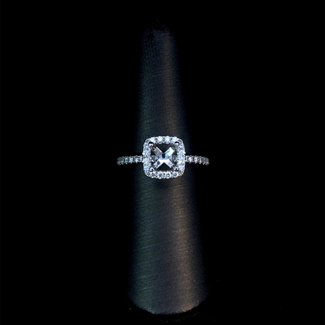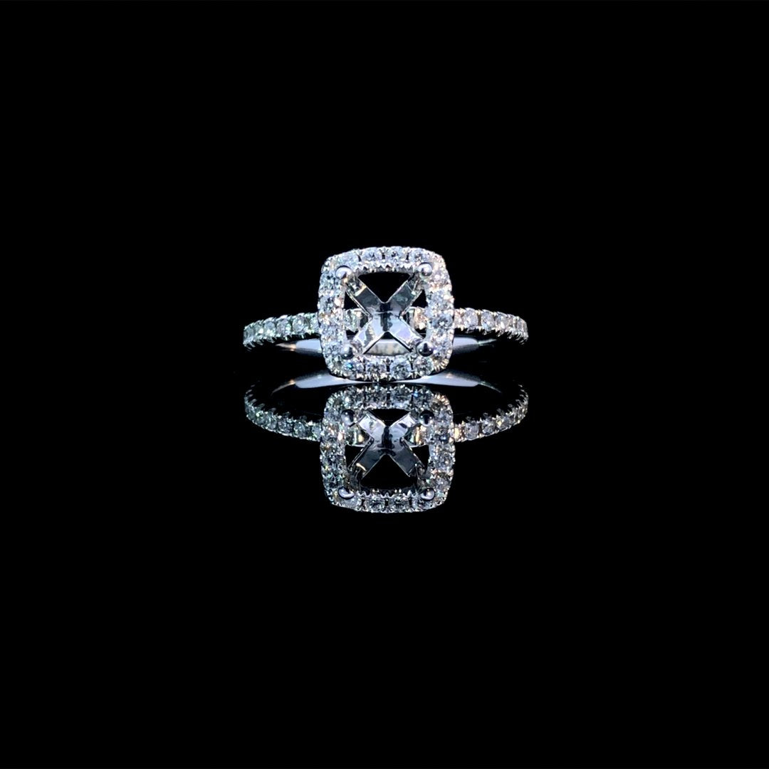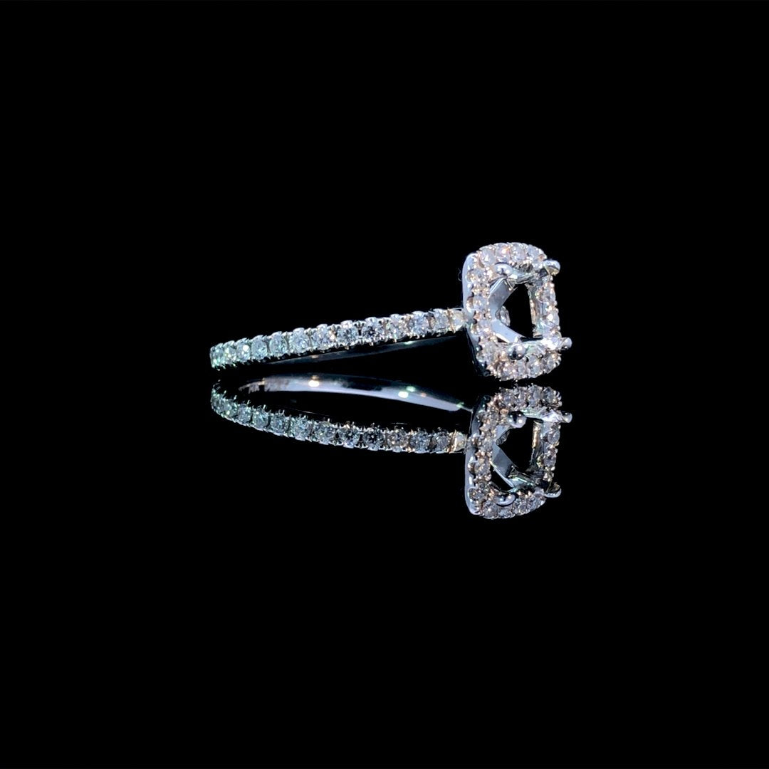 Create your dream engagement ring with this beautiful diamond semi mount. Featuring a stunning cushion-shaped halo and additional diamonds on the band, this 14kt white gold setting shines with a total diamond weight of .55ctw. Choose from our wide selection of loose stones to customize your perfect ring. Price is for the semi mount only. Center stone will be added at an additional cost. This ring is a size 7. If that size is not a perfect fit, first time sizing is free at the time of purchase. Additional sizing fees may apply.