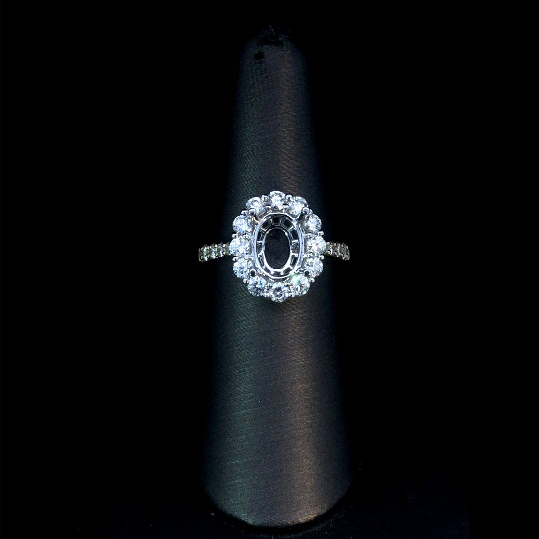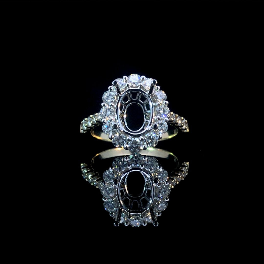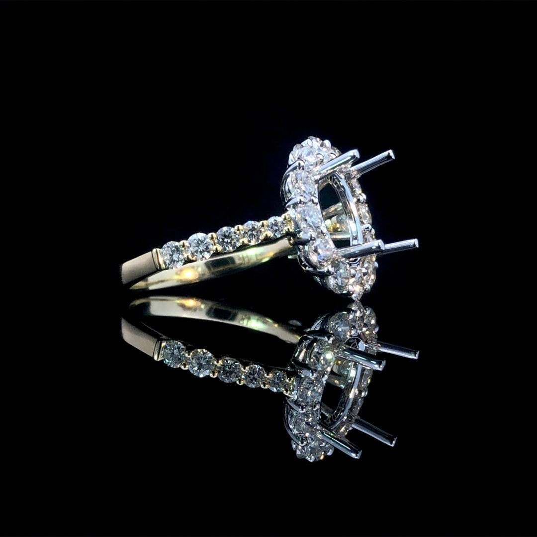 Complete your dream engagement ring with this exquisite diamond semi mount. Featuring a stunning oval halo and cascading diamonds down the band, totaling 1.20ctw, set in 2-tone 14kt gold. Personalize it with your choice of oval center stone from our wide selection. Make your special moment one to remember. Price is for the semi mount only. Center stone will be added at an additional cost. This ring is a size 6.5. If that size is not a perfect fit, first time sizing is free at the time of purchase. Additional sizing fees may apply.