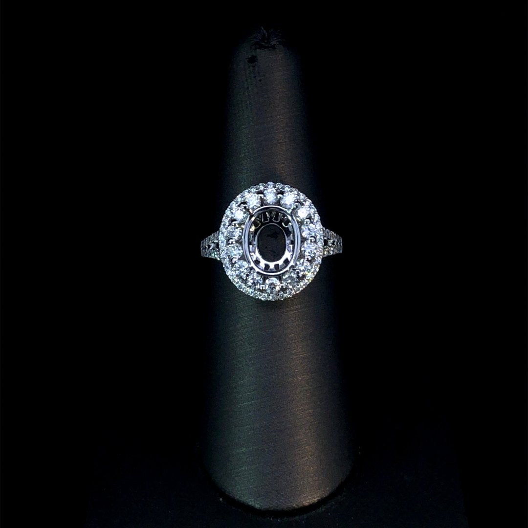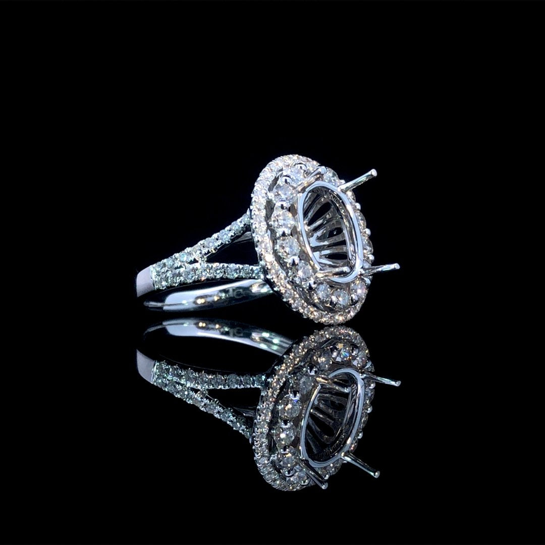 Create your dream engagement ring with this 14kt white gold diamond semi mount. Featuring a double halo and split shank with .98ctw of sparkling round diamonds, this stunning design will perfectly showcase the oval stone of your choice from our wide selection of loose stones. Price is for the semi mount only. Center stone will be added at an additional cost. This ring is a size 6.5. If that size is not a perfect fit, first time sizing is free at the time of purchase. Additional sizing fees may apply.