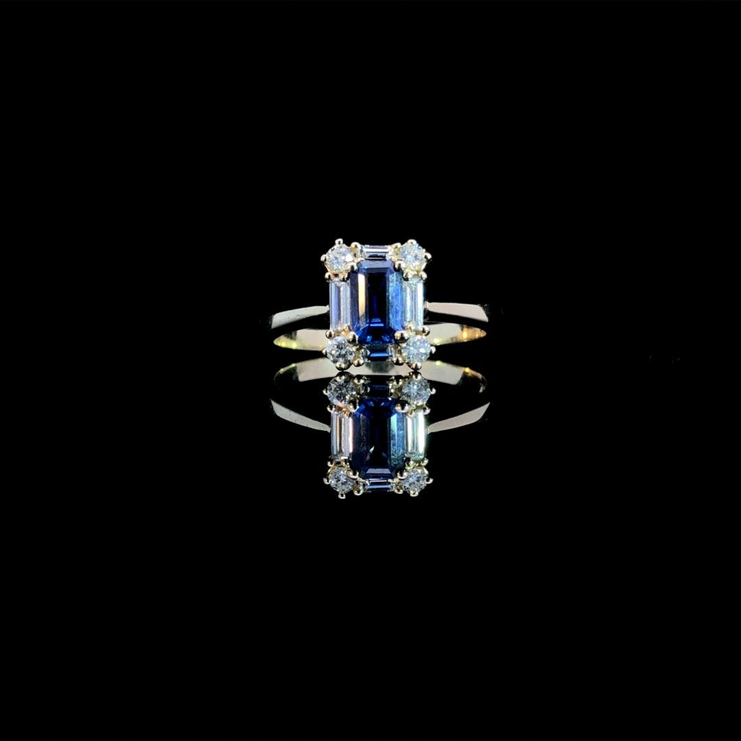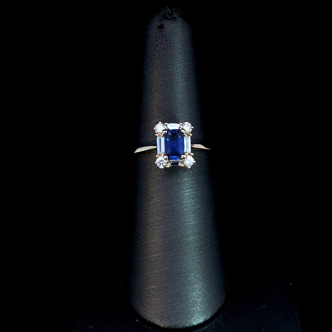 Elevate any look with this stunning ring. Featuring a .62ct emerald cut sapphire, surrounded by a sparkling diamond halo of round and baguette diamonds totaling .35ctw, and set in 14kt yellow gold, this ring is the perfect combination of elegance and luxury. Add a touch of glamour to any outfit with this precious gemstone ring. This ring is a size 6.5. If that size is not a perfect fit, first time sizing is free at the time of purchase. Additional sizing fees may apply.
