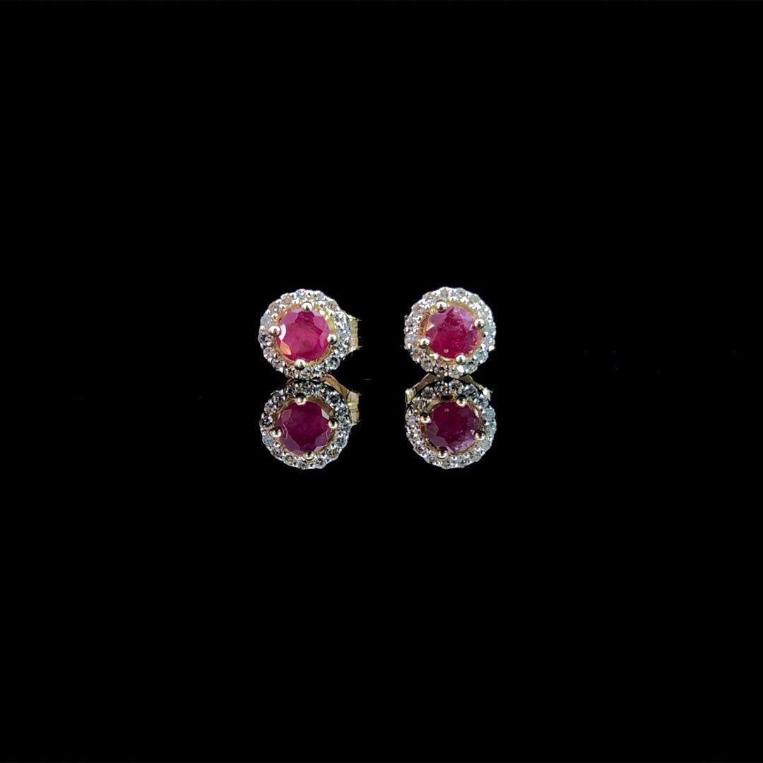 Add a pop of color to your jewelry collection with these stunning ruby and diamond stud earrings. With a sparkling round ruby at the center, surrounded by a halo of round diamonds totaling .10ctw, these earrings are set in 10kt yellow gold for a classic and elegant look.