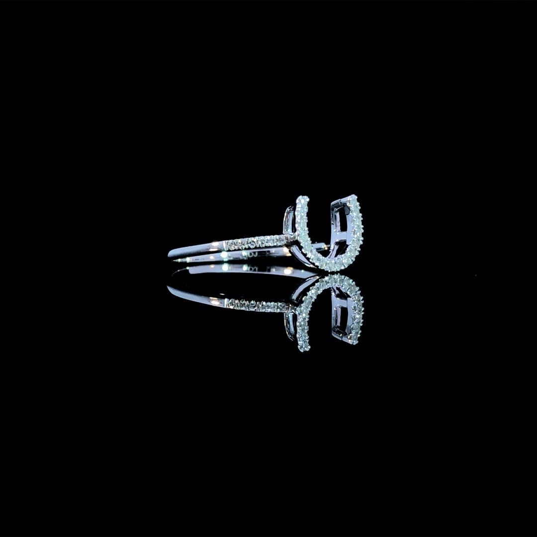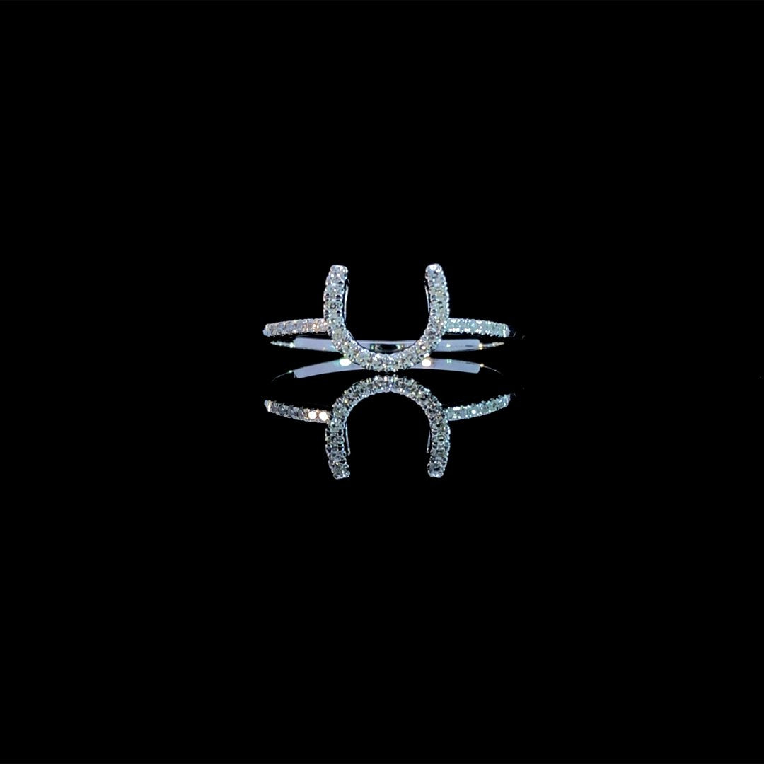 This 14kt white gold ring features a stunning diamond horseshoe and additional diamonds down the band, totaling .10ctw. Perfect for any occasion, it adds a touch of elegance and sparkle to any outfit. This ring is a size 7. If that size is not a perfect fit, first time sizing is free at the time of purchase. Additional sizing fees may apply.