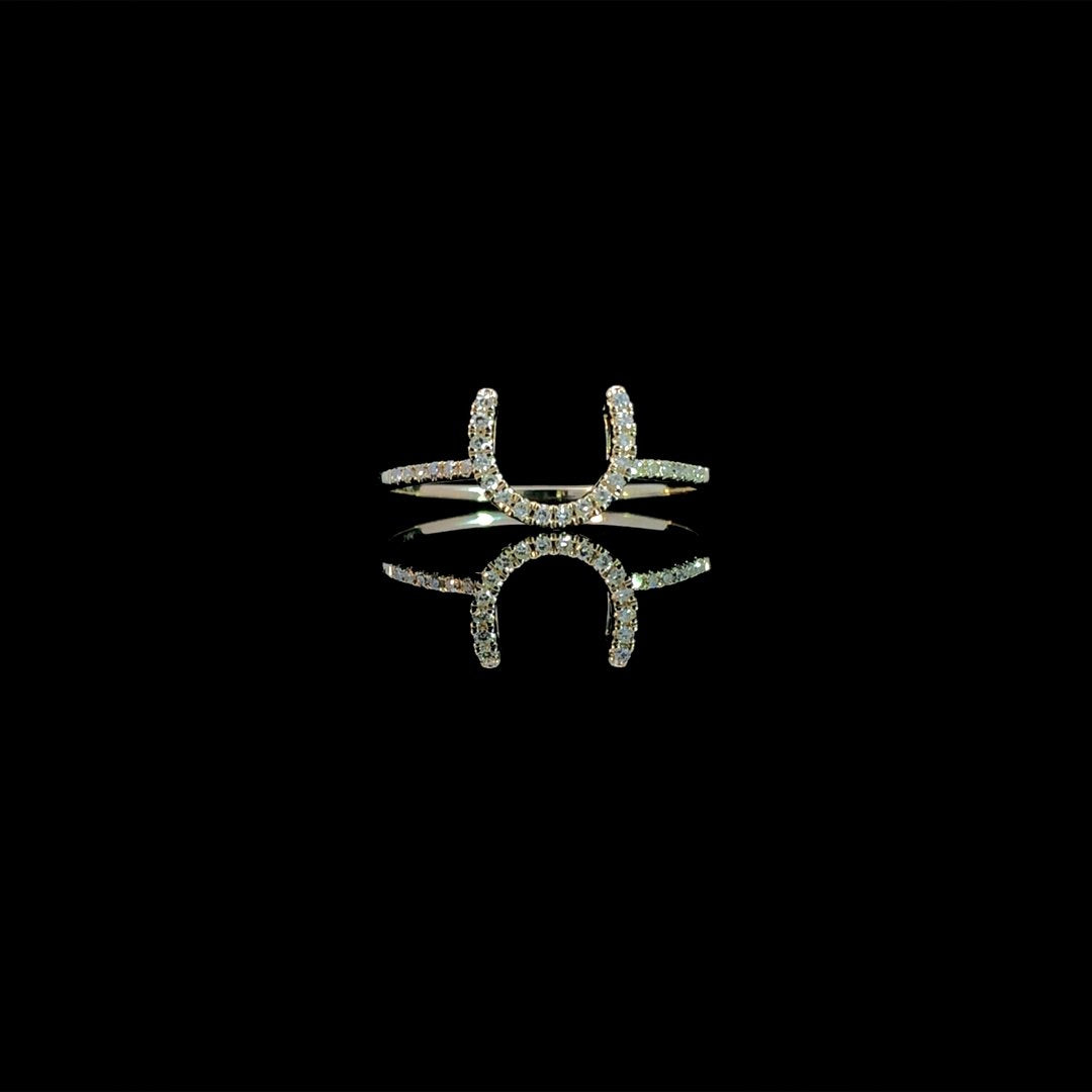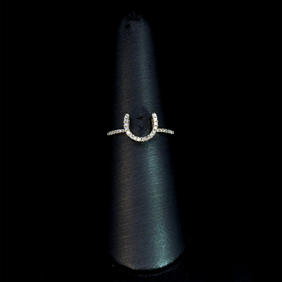 Upgrade your jewelry collection with this cute ring. Made of 14kt yellow gold, this ring features a lucky horseshoe design adorned with sparkling diamonds. The band is also embellished with diamonds, bringing the total weight to .10ctw. This ring is a size 7. If that size is not a perfect fit, first time sizing is free at the time of purchase. Additional sizing fees may apply.