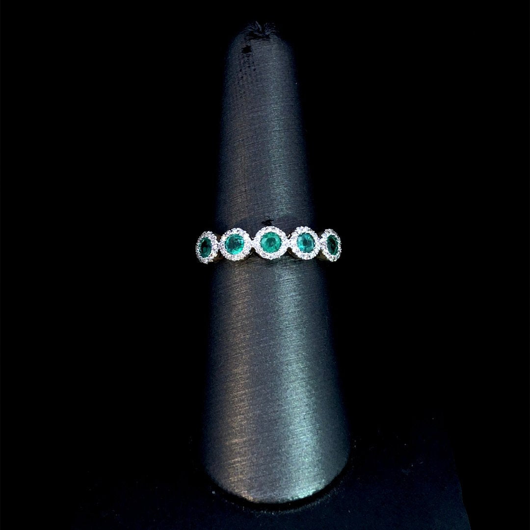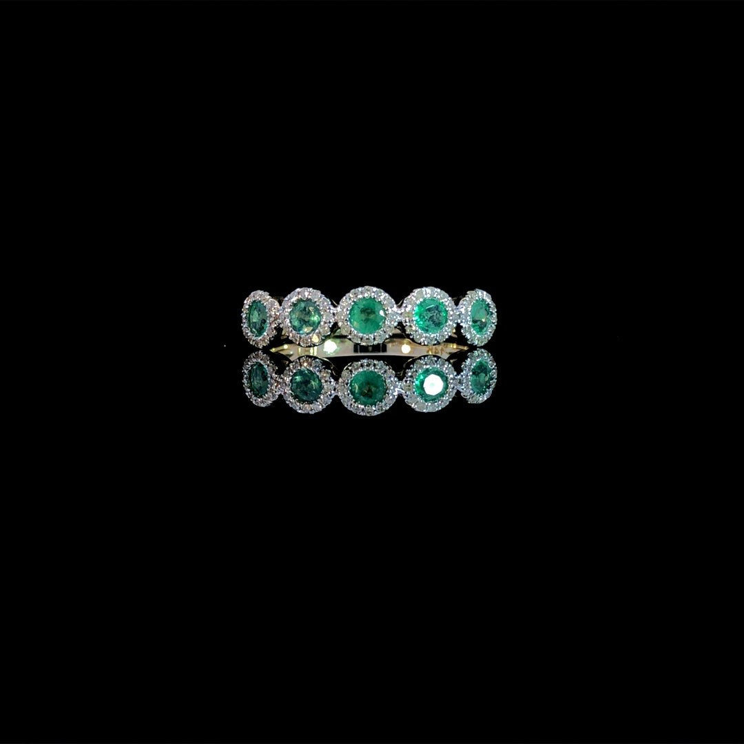 Add a pop of color to your look with this gemstone and diamond band. Featuring 5 round emeralds totaling .70ctw, surrounded by .15ctw of round diamond halos, set in 14kt yellow gold, this band exudes elegance and sophistication. Elevate your style with this stunning piece. This ring is a size 7. If that size is not a perfect fit, first time sizing is free at the time of purchase. Additional sizing fees may apply.