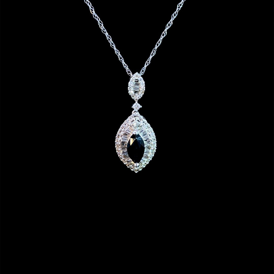 Add a touch of elegance to your jewelry collection with this sapphire and diamond pendant. This stunning piece showcases a marquise sapphire at its center, accented by .33ctw of sparkling round and baguette diamonds set in 14kt white gold. Elevate any outfit with this gorgeous pendant. Chain is not included.