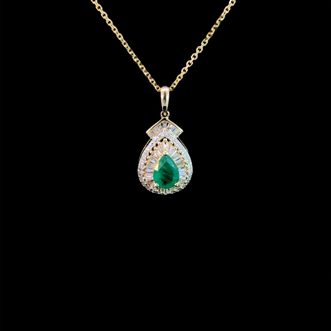 Make a statement with this gorgeous pendant! Featuring a stunning pear-shaped emerald, surrounded by a halo of round and baguette diamonds totaling .36ctw. Crafted in 14kt yellow gold, this piece is sure to elevate any outfit. Chain is not included.
