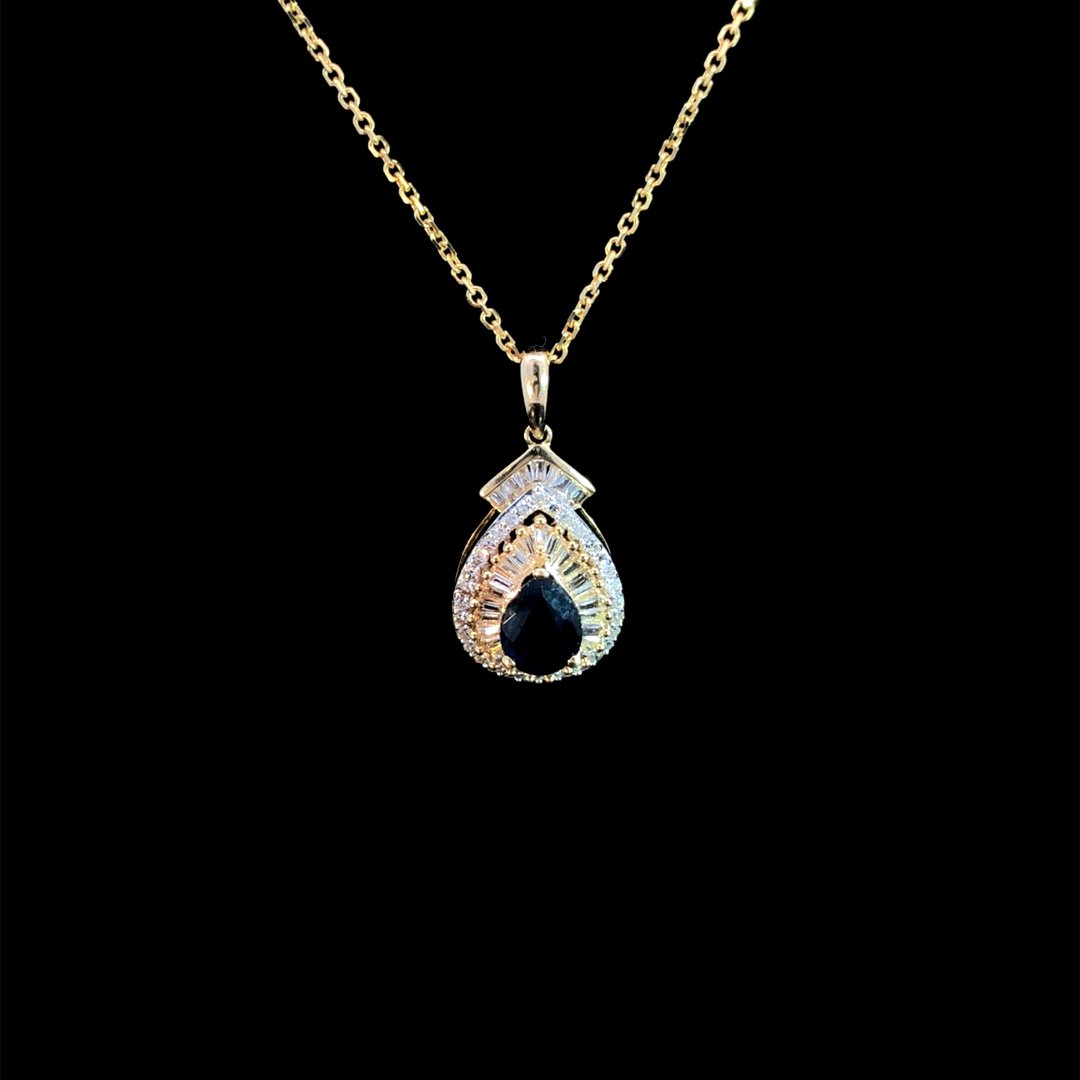 Add some elegance to your jewelry collection with this beautiful pendant. Featuring a stunning pear-shaped sapphire adorned with .36ctw of sparkling round and baguette diamonds, all set in luxurious 14kt yellow gold. Elevate any outfit with this timeless and sophisticated accessory. Chain is not included.