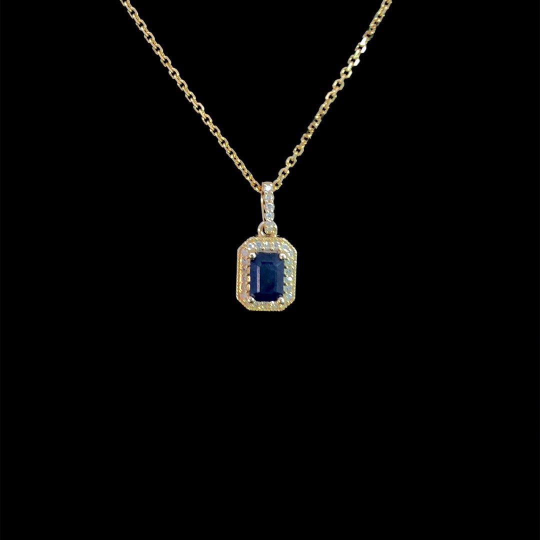 Elevate your style with our stunning 164038 pendant. Featuring a .77ct emerald cut sapphire set in 14kt yellow gold with a sparkling diamond halo. With a total weight of .10ctw, this pendant is a timeless and elegant addition to any collection. Chain is not included