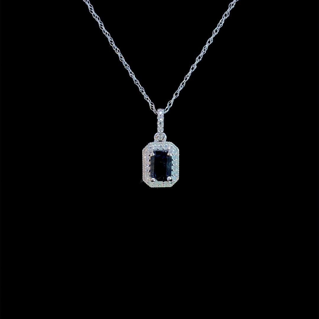 Elevate your look with this stunning pendant. A .77ct emerald cut sapphire takes center stage, surrounded by a diamond halo and bail crafted from 14kt white gold. Accented with .10ctw of round diamonds, this piece exudes elegance and sophistication. Perfect for any outfit, this pendant will be the star of your jewelry collection. Chain is not included.