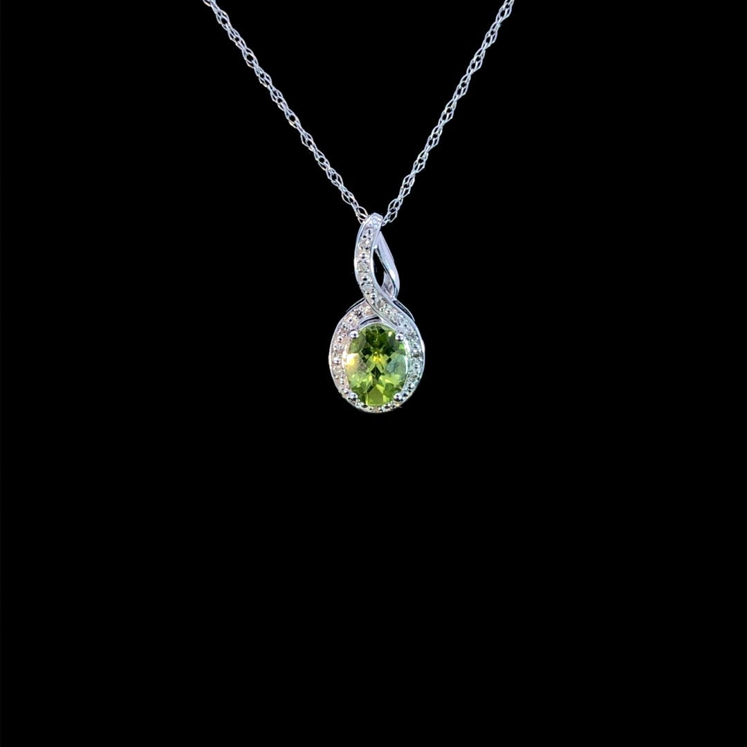This elegant pendant showcases a sparkling oval peridot surrounded by a halo of shimmering round diamonds. The split bail design, crafted in 10kt white gold, adds a touch of luxury. Perfect for adding a pop of color and sophistication to any outfit. Chain is not included.