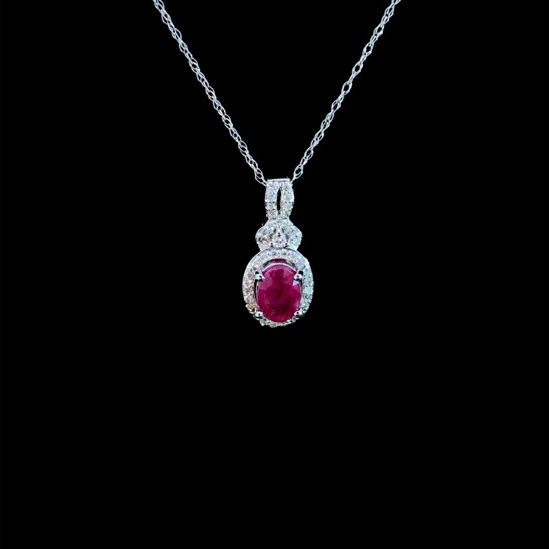 Elevate any outfit with this 10kt white gold pendant featuring a captivating oval ruby and sparkling .16ctw of round diamond accents. Perfect for adding a touch of sophistication to any occasion, this stunning piece is sure to impress. Chain is not included.