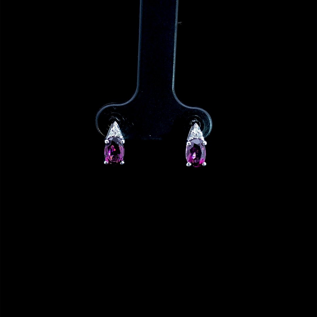 Add a touch of elegance with these stunning diamond and gemstone stud earrings. The gorgeous rhodolite garnets are perfectly complemented by the sparkling .03ctw of round diamond accents, all set in 10kt white gold. Elevate any outfit with these luxurious earrings.