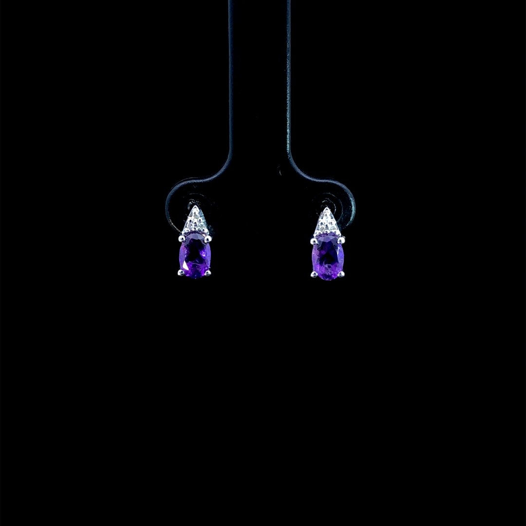 Add a pop of color to your collection with these amethyst and diamond studs. Featuring oval amethyst gemstones and .03ctw of round diamond accents, these 10kt white gold earrings are perfect for any occasion.