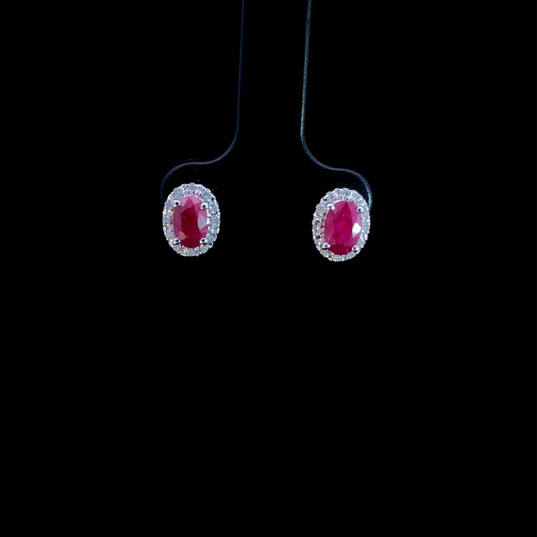 Elevate your style with these stunning stud earrings. Each pair features a dazzling oval ruby at the center, surrounded by a halo of sparkling round diamonds totaling .10ctw set in luxurious 14kt white gold. Add sophistication and glamour to any outfit with these elegant earrings.