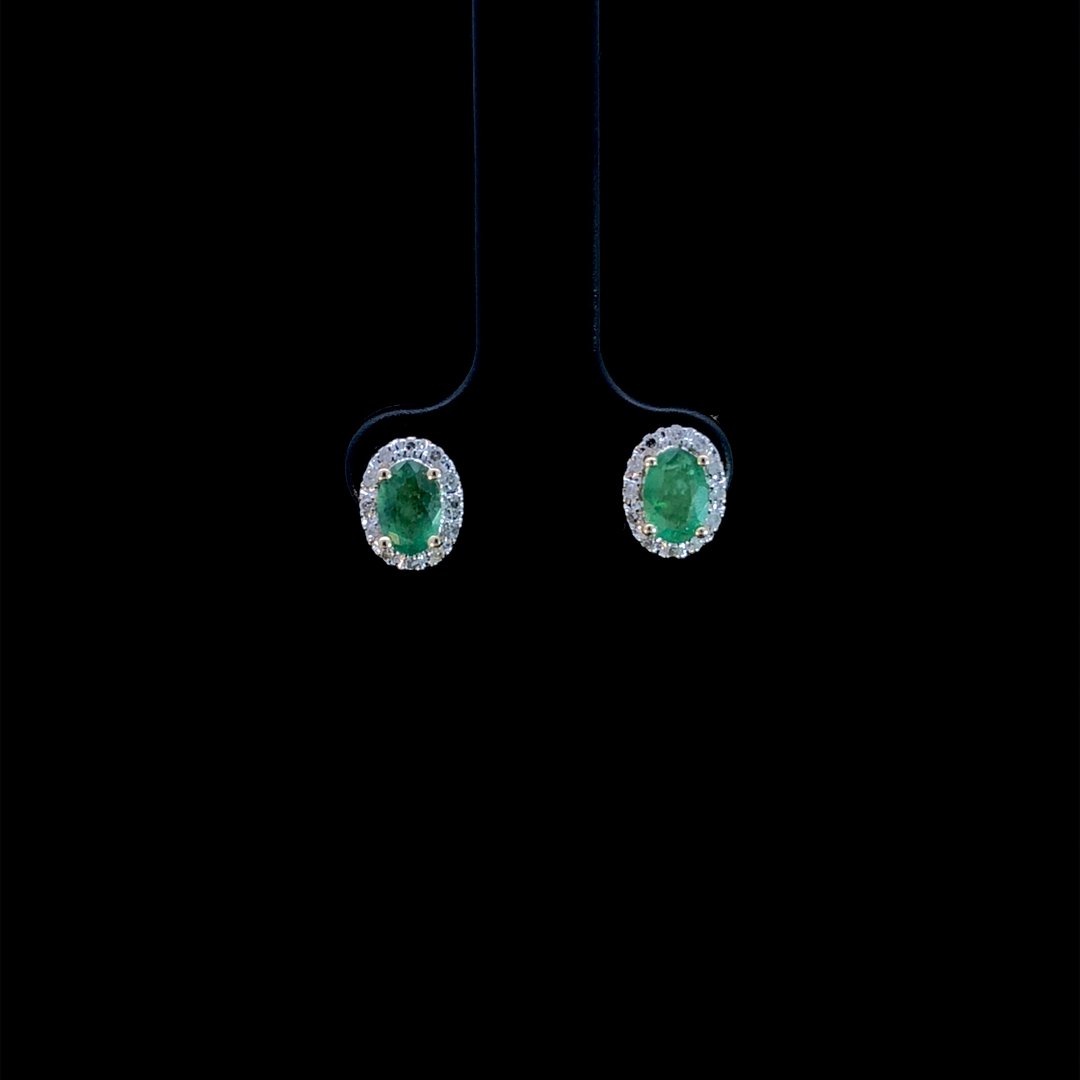 Add a touch of elegance to your wardrobe with these stunning stud earrings. Crafted in 14kt yellow gold, they feature oval emerald gemstones surrounded by a halo of sparkling round diamonds totaling .10ctw. Perfect for any occasion, these earrings are sure to elevate your look.