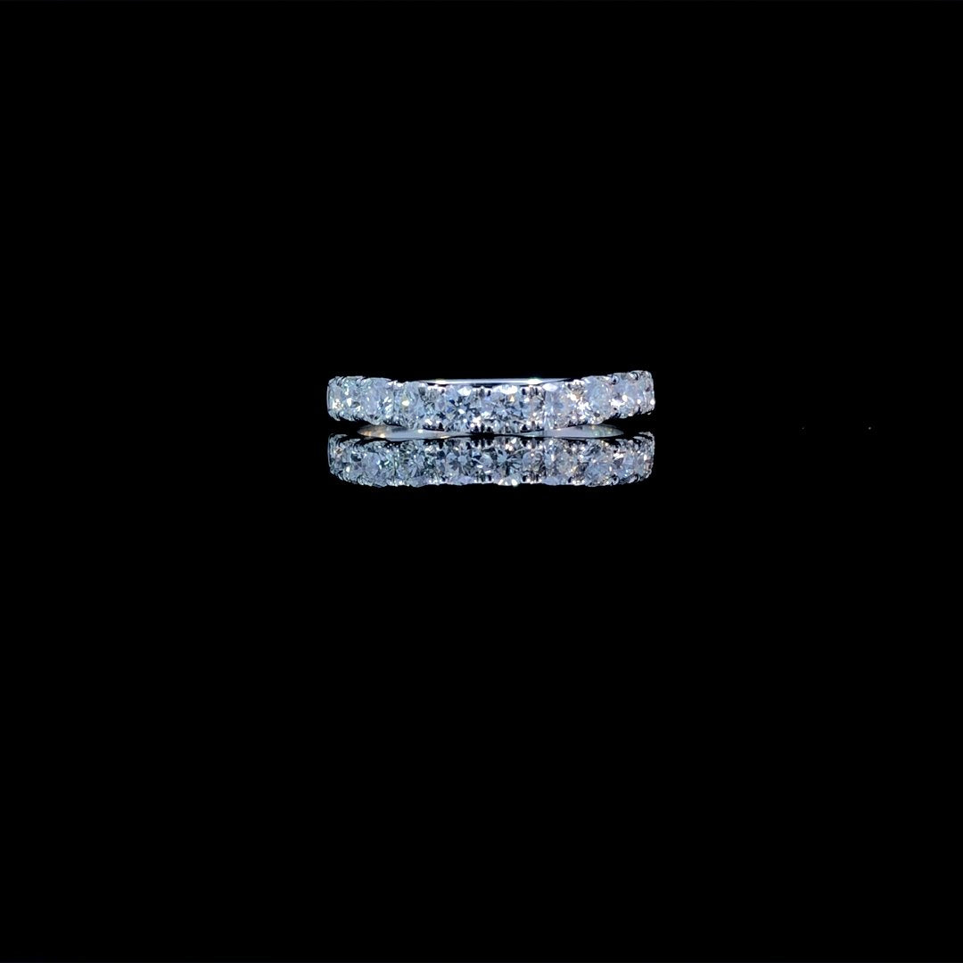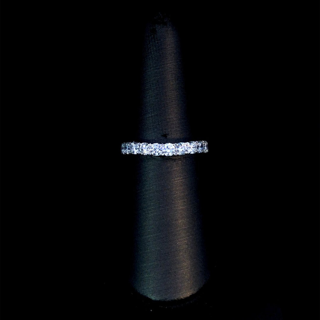 Elevate your jewelry collection with this beautiful diamond band. Crafted in sleek 14kt white gold, this band boasts a curved design to seamlessly fit with another ring. With a sparkling 1.00ctw of round diamonds, this band exudes luxury and sophistication. A must-have for any elegant ensemble. This ring is a size 7. If that size is not a perfect fit, first time sizing is free at the time of purchase. Additional sizing fees may apply.