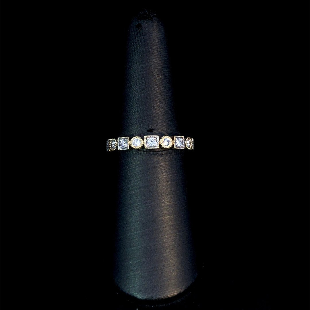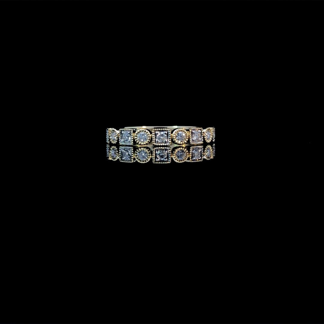 Complete your luxurious look with this diamond band. Featuring alternating round and square shapes with .25ctw of sparkling round diamonds and milgrain detailing, this 10kt yellow gold band is the perfect choice for stacking or adding to your collection. Elevate your style with this chic and sophisticated piece. This ring is a size 6.75. If that size is not a perfect fit, first time sizing is free at the time of purchase. Additional sizing fees may apply.