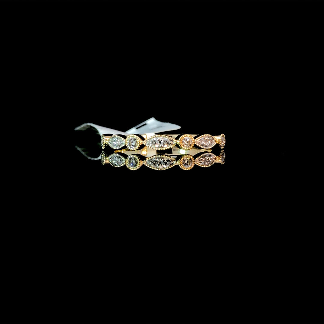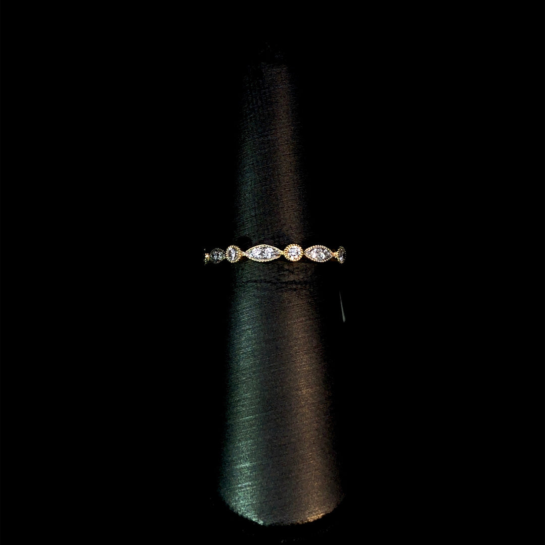 This elegant 14kt yellow gold diamond band features .20ctw of sparkling round diamonds set in unique alternating shapes. Stack it with other bands or wear it alone for a touch of glamour. Perfect for any occasion, this band will add a touch of sophistication to any outfit. This ring is a size 6.5. If that size is not a perfect fit, first time sizing is free at the time of purchase. Additional sizing fees may apply.