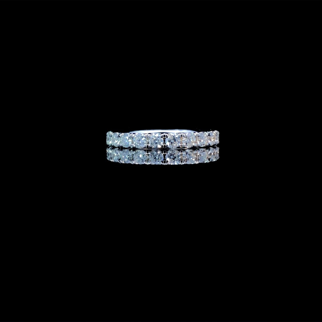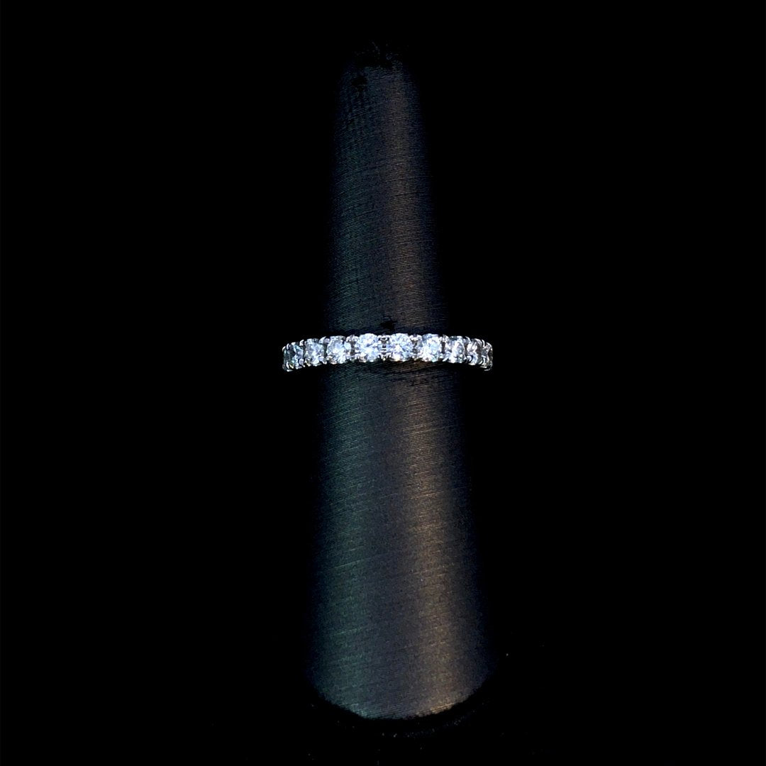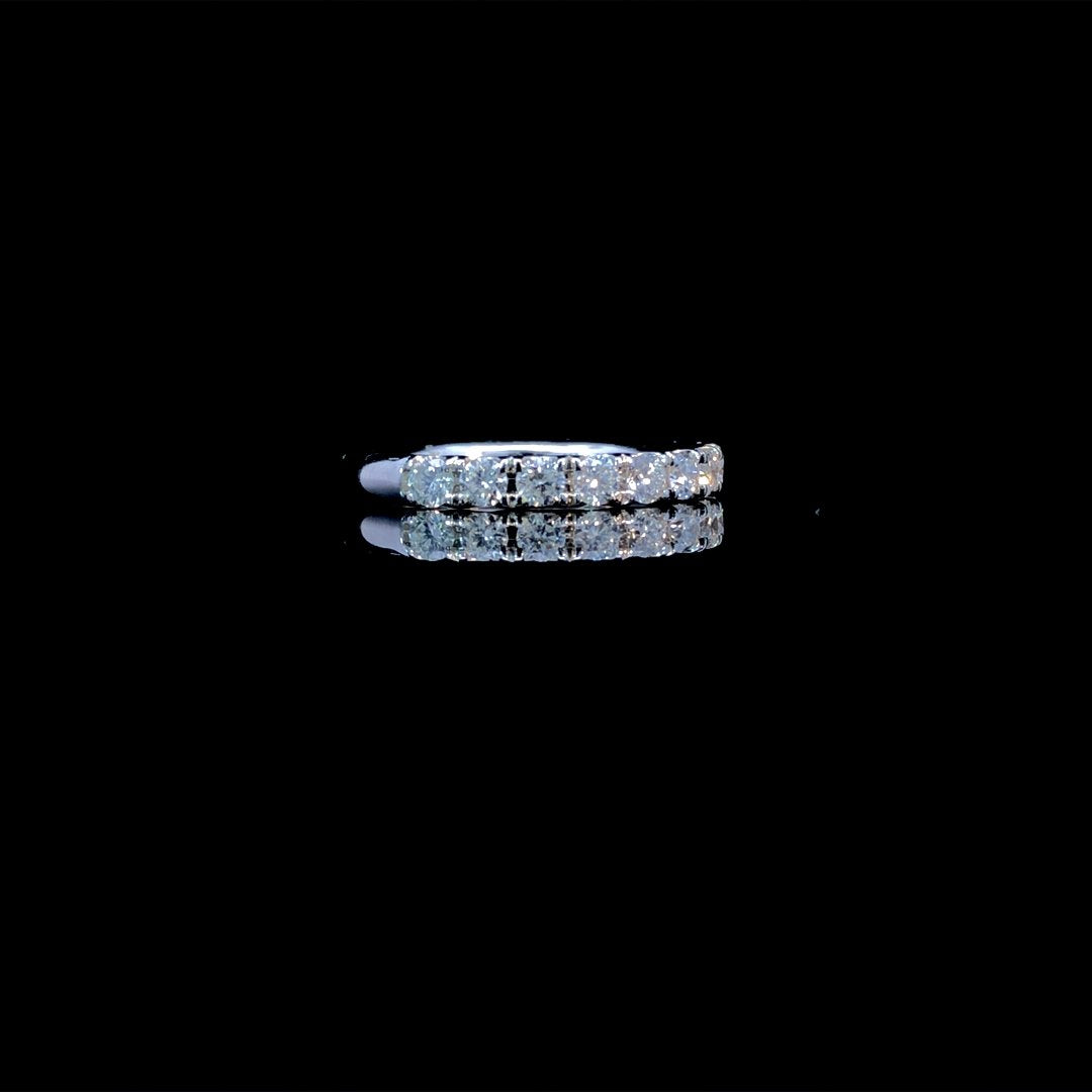 This elegant 14kt white gold diamond band is the perfect addition to any jewelry collection. With a total of .75ctw round of diamonds, it adds a touch of sparkle to any outfit. Pair it with your engagement ring or wear it alone for a classic and timeless look. This ring is a size 6.5. If that size is not a perfect fit, first time sizing is free at the time of purchase. Additional sizing fees may apply.