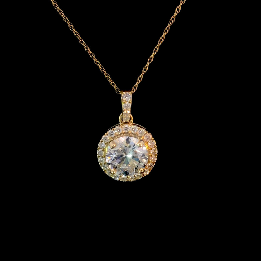 Embrace timeless elegance with this diamond pendant. A certified 1.52ct round diamond sits at the center, surrounded by a halo and bail of diamonds, totaling 1.76ctw. Crafted in 14kt yellow gold, it exudes sophistication and luxury. Elevate any outfit and make a statement with this stunning piece. Chain is not included.
