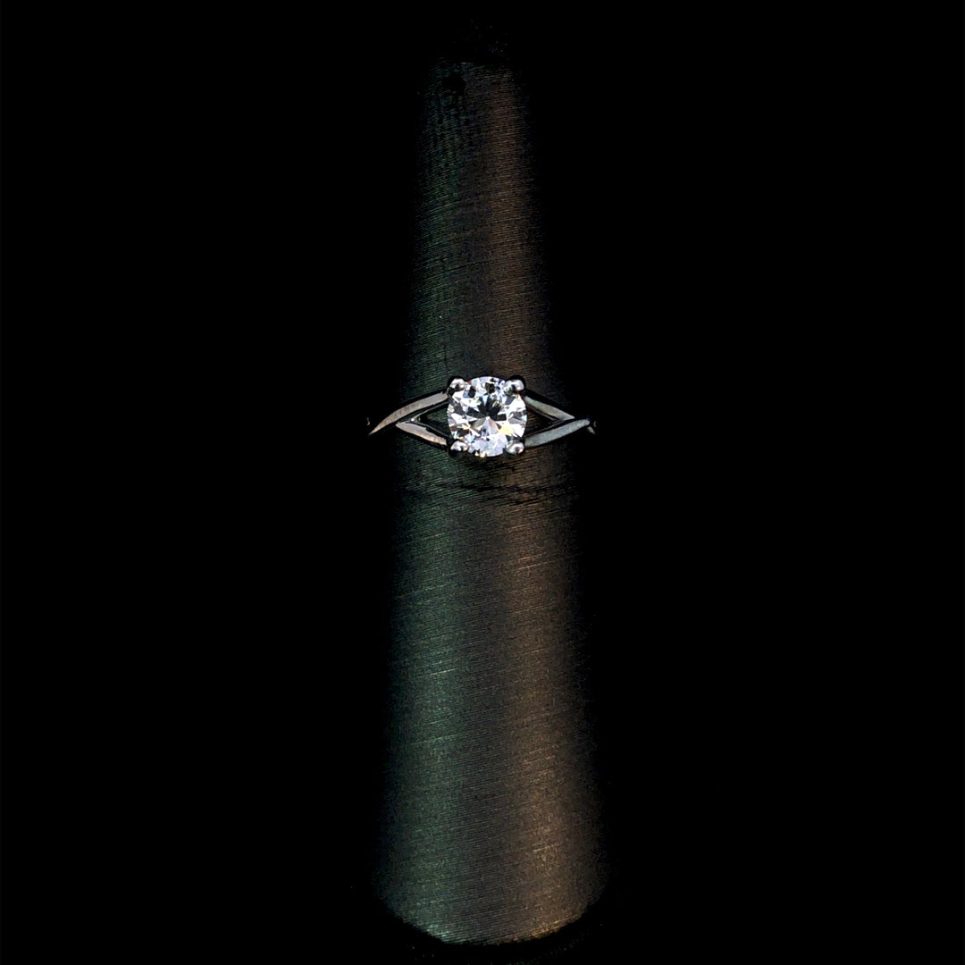 Express your love with this stunning diamond engagement ring. Featuring a certified .70ct round diamond in 14kt white gold with a unique twisted band, to keep it simple, yet timeless with added detail. Perfect for everlasting commitment! This ring is a size 6.5. If that size is not a perfect fit, first time sizing is free at the time of purchase. Additional sizing fees may apply.