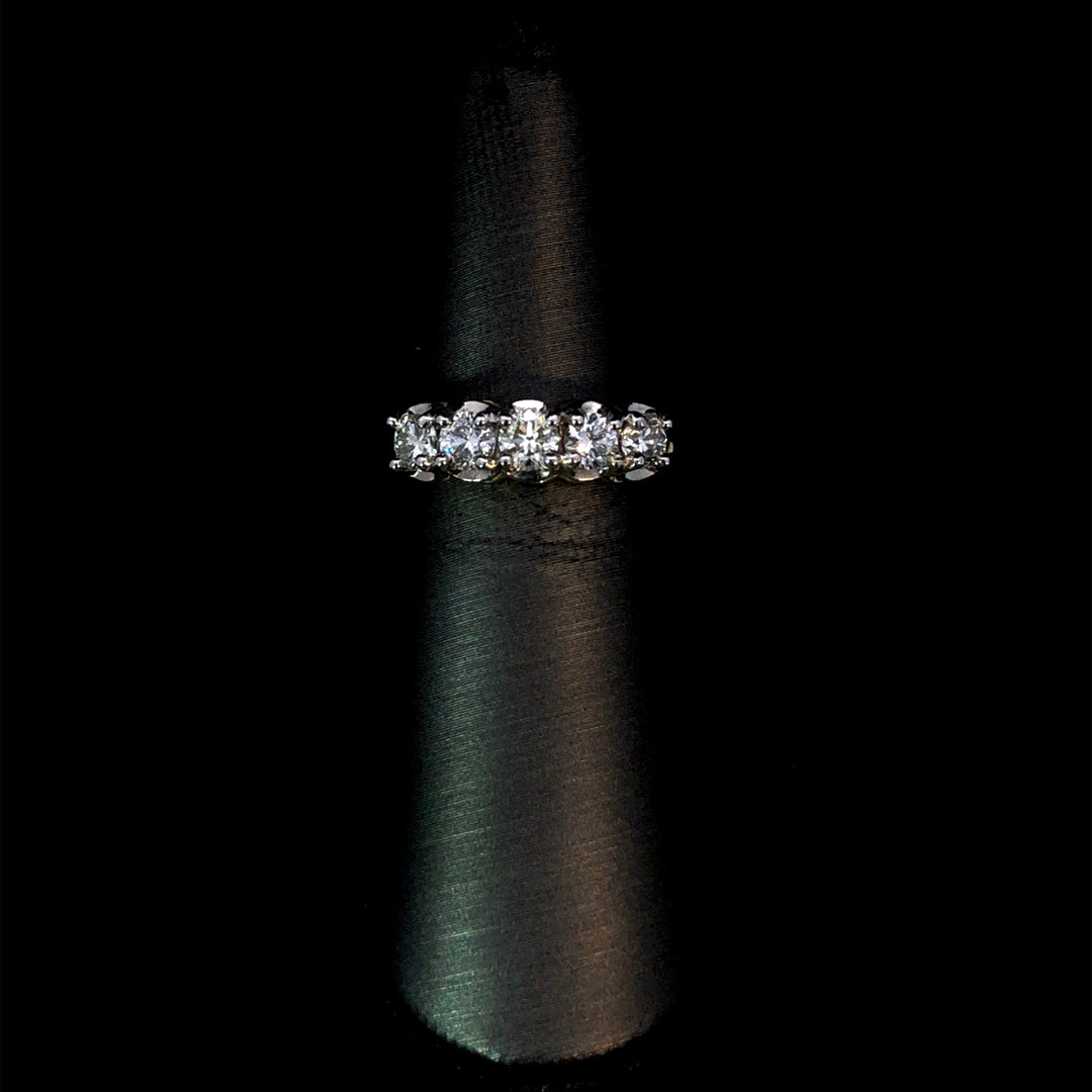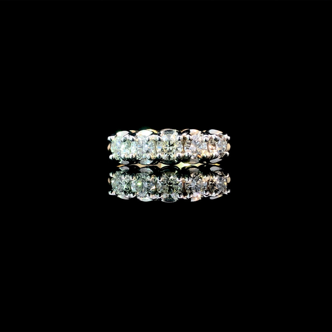 Crafted with 2-tone 14kt gold, this diamond anniversary band features .96ctw of sparkling round diamonds. Enhance your special wardrobe with this shimmering and elegant piece. This ring is a size 6. If that size is not a perfect fit, first time sizing is free at the time of purchase. Additional sizing fees may apply.