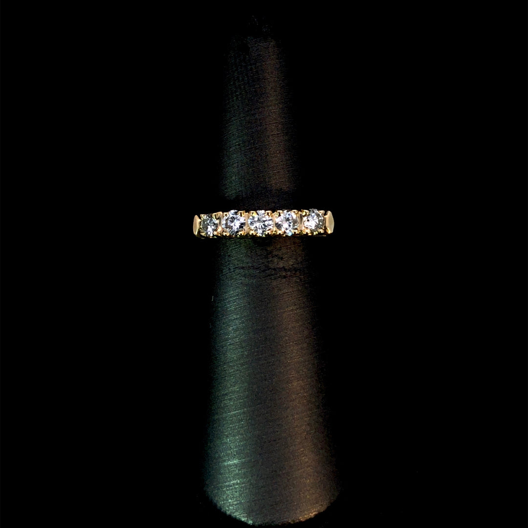 Add a touch of elegance to any outfit with this diamond band. Crafted with 14kt yellow gold, this band features 5 sparkling round diamonds totaling .60ctw. Perfect for any occasion, make a statement with this stunning piece. This ring is a size 6. If that size is not a perfect fit, first time sizing is free at the time of purchase. Additional sizing fees may apply.