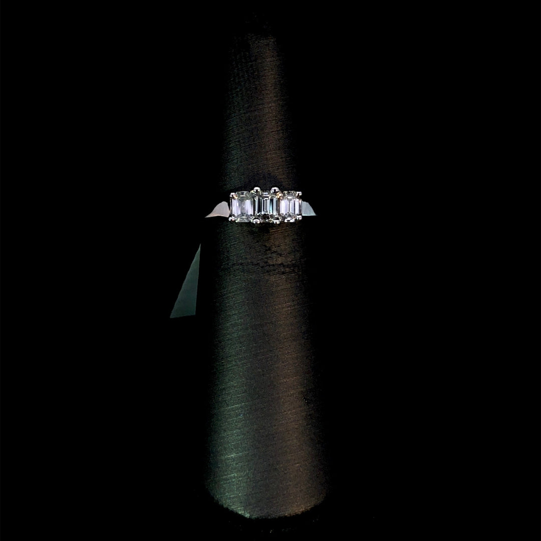 Upgrade your jewelry collection with this stunning diamond 3 stone ring. Crafted with .50ctw of sparkling emerald cut diamonds, set in luxurious 14kt white gold, this ring is sure to turn heads. Elevate your style and add a touch of elegance to any outfit with this gorgeous piece. This ring is a size 5.75. If that size is not a perfect fit, first time sizing is free at the time of purchase. Additional sizing fees may apply.