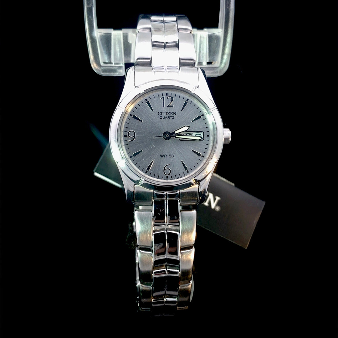 Elevate your style with this elegant stainless steel Citizen watch. Featuring a sleek silver face and convenient daydate feature, this watch is not only fashionable but also practical. Perfect for any woman looking for a sophisticated timepiece.