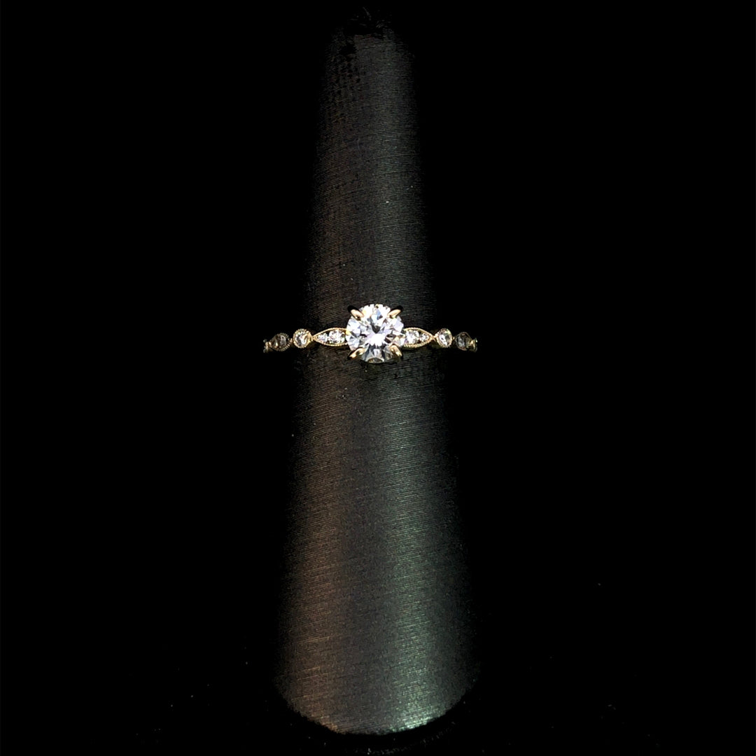 Elevate your style with this diamond ring. Featuring a certified .53ct round diamond on a 14kt yellow gold decorative band. The .23ctw of round accent diamonds in an alternating pattern add a chic and unique touch. Upgrade your look with this stunning piece. This ring is a size 6.75. If that size is not a perfect fit, first time sizing is free at the time of purchase. Additional sizing fees may apply.