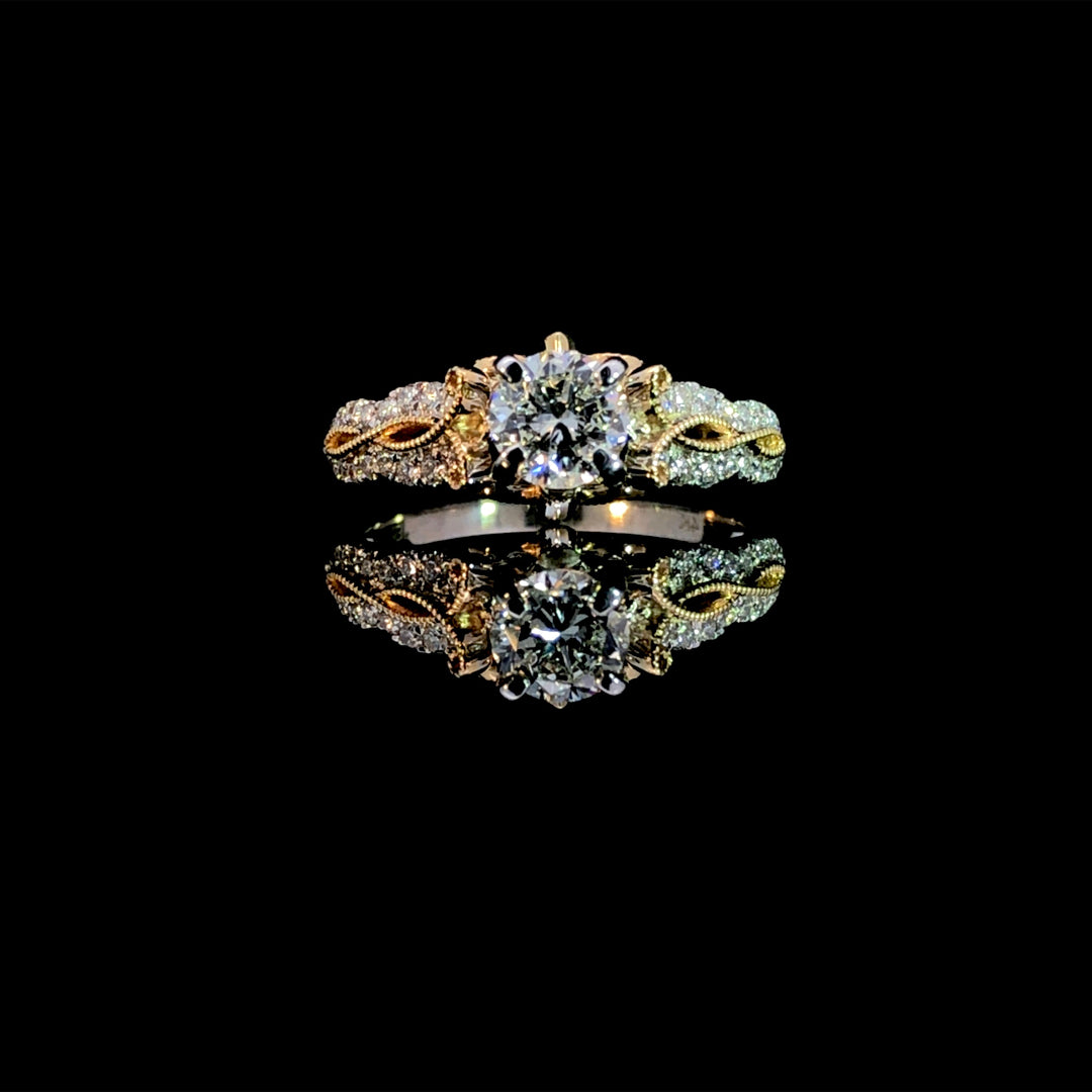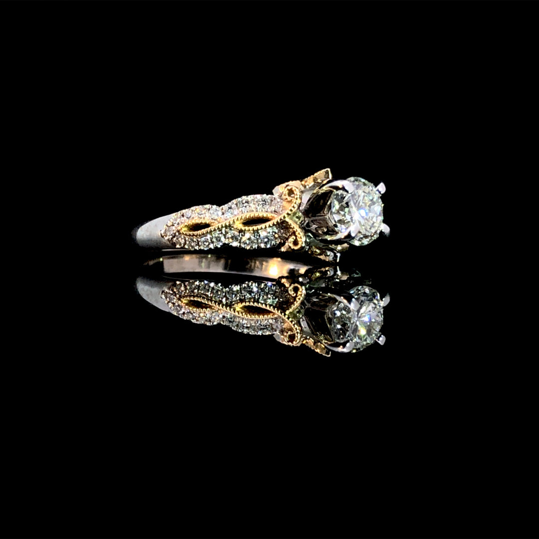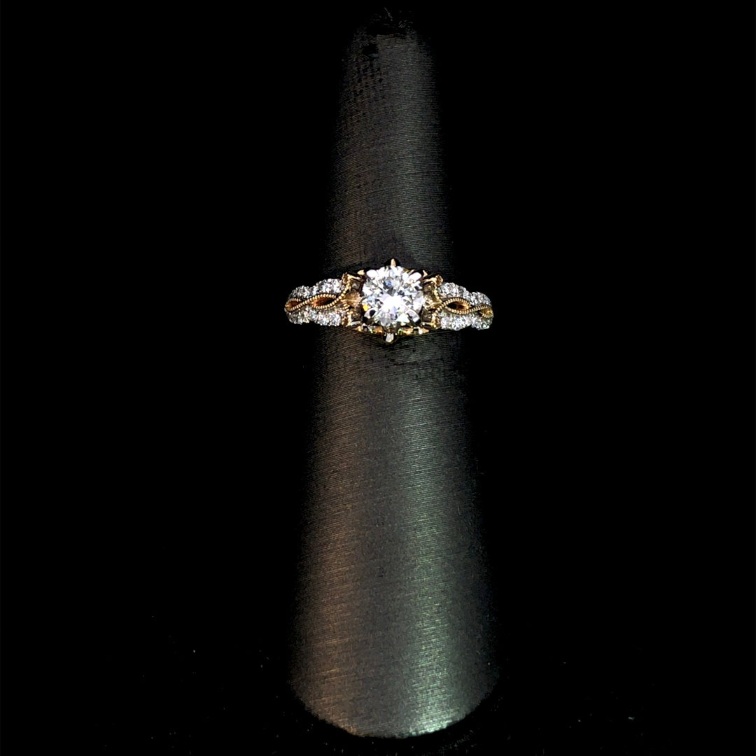 This stunning vintage-inspired ring boasts a .63ct round diamond at its center, certified as a G in color and VVS2 in clarity. The intricate 14kt 2-tone gold mounting is adorned with .21ctw of round diamond accents. Elevate your style and radiate elegance with this exquisitely crafted piece. This ring is a size 6. If that size is not a perfect fit, first time sizing is free at the time of purchase. Additional sizing fees may apply.