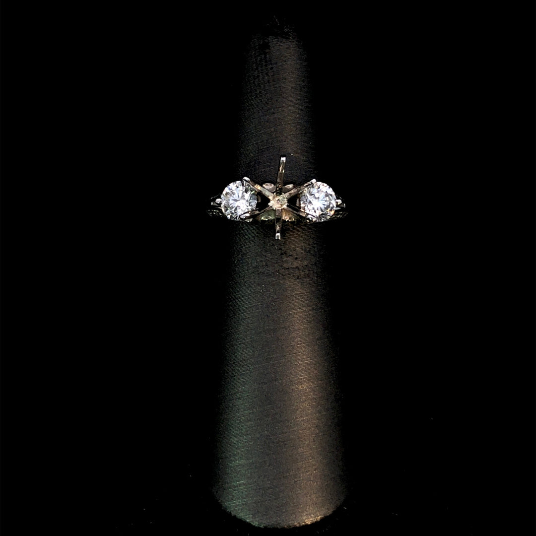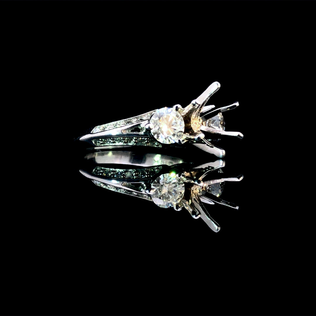 Upgrade your engagement ring with this luxurious diamond semi mount. Featuring 2 large round diamond side stones and a split shank band with additional diamond accents, this 14kt white gold setting features an impressive 1.25ctw of sparkle before even adding your desired center stone. Make a statement with this exquisite semi mount. Price is for the semi mount only. Center stone will be added at an additional cost. This ring is a size 5.25. If that size is not a perfect fit, first time sizing is free at the time of purchase. Additional sizing fees may apply.