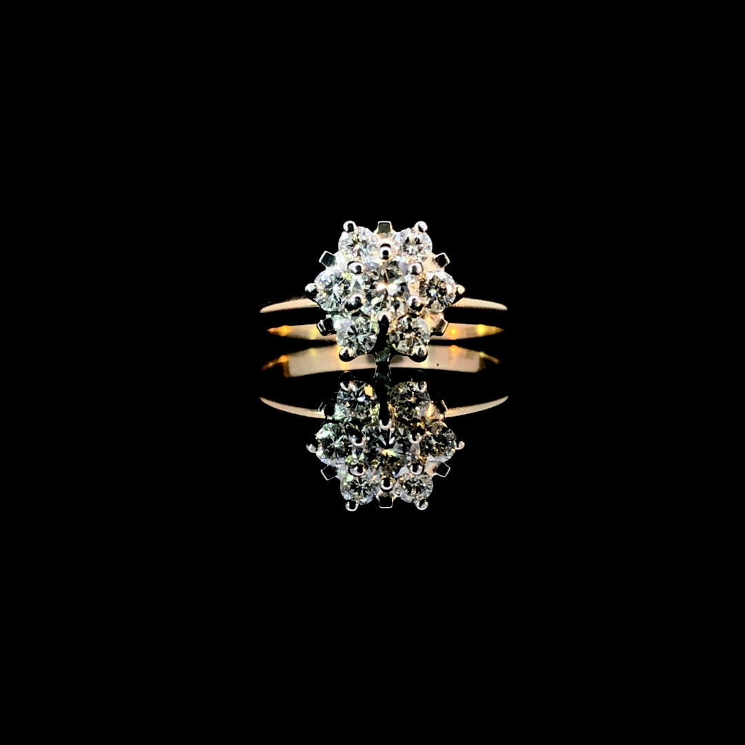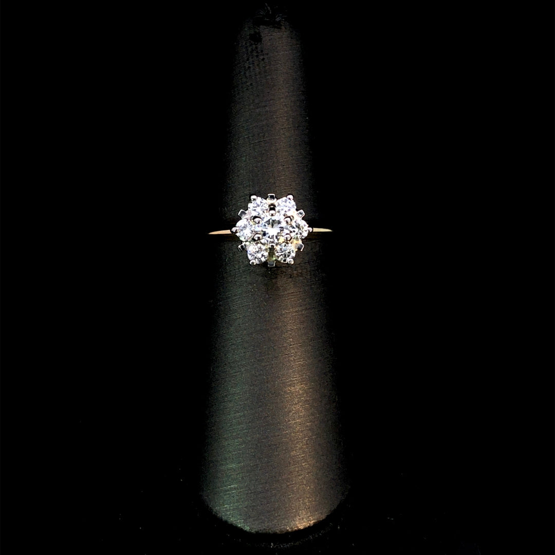 Embrace classic elegance with this stunning 14kt 2-tone gold ring. Featuring a flower cluster design with .69ctw of round diamonds, it's sure to add a touch of sparkle to any look. This ring is a size 7.25. If that size is not a perfect fit, first time sizing is free at the time of purchase. Additional sizing fees may apply.