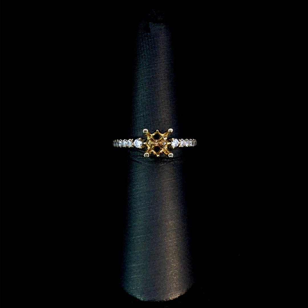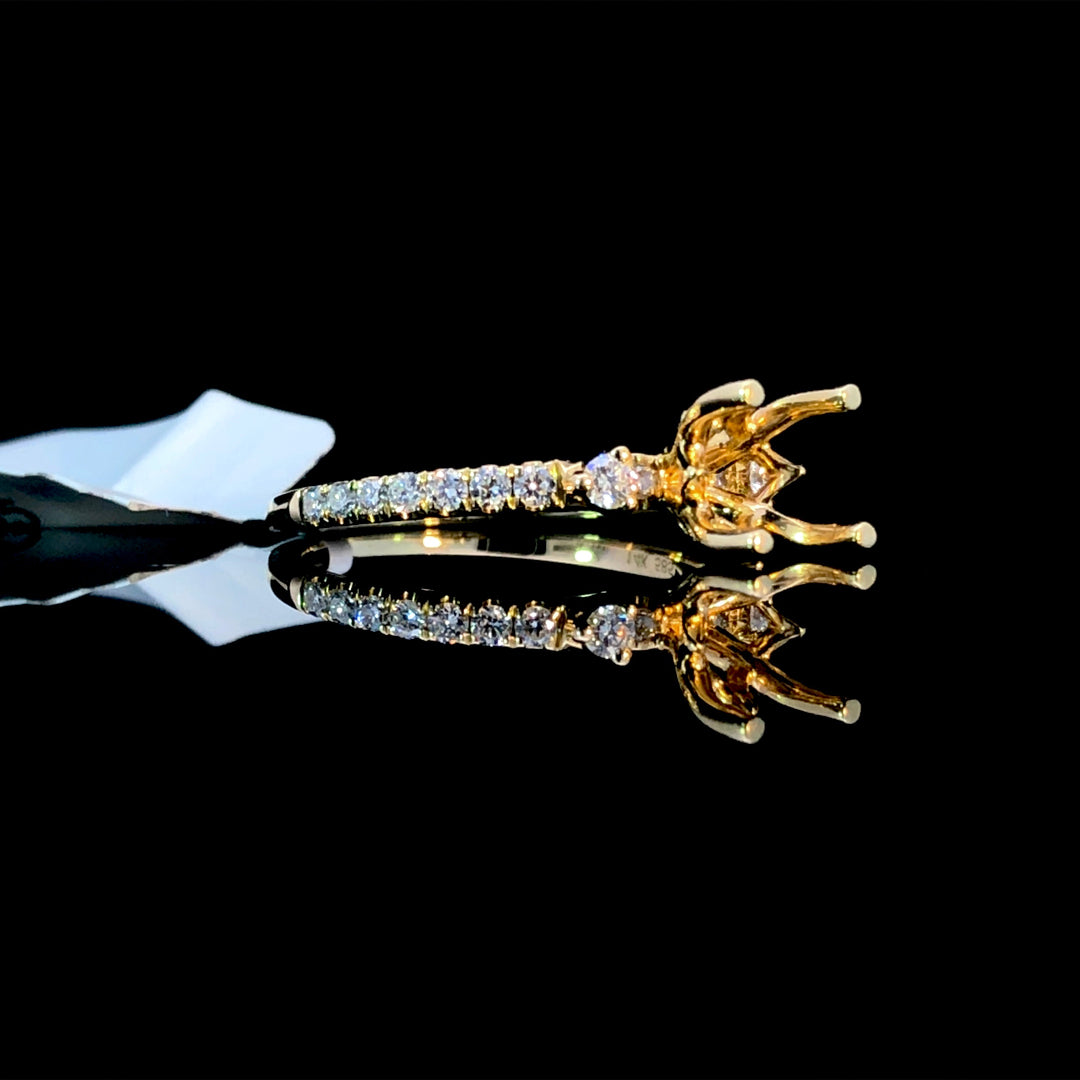 This diamond semi mount showcases a classic design with 0.30ctw of round diamonds cascading down a 14kt yellow gold band. It elegantly frames your chosen center stone from our loose stone collection, allowing you to craft a personalized ring that highlights your individual style. Price is for the semi mount only. Center stone will be added at an additional cost. This ring is a size 6.5. If that size is not a perfect fit, first time sizing is free at the time of purchase. Additional sizing fees may apply.