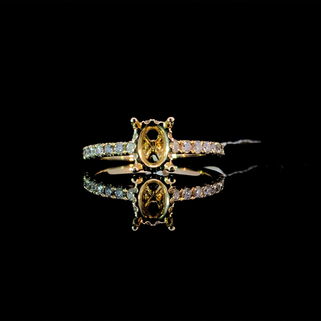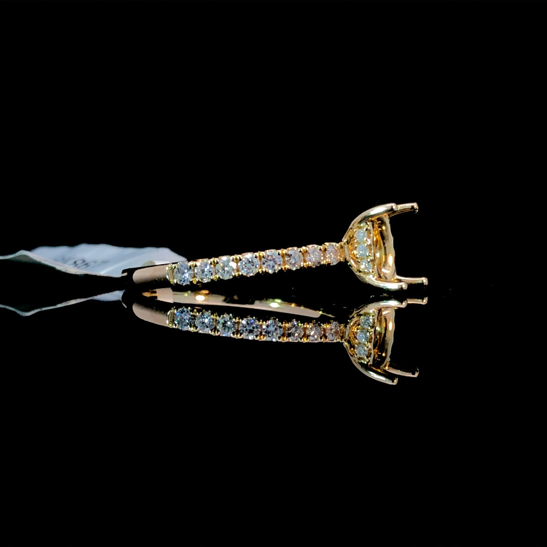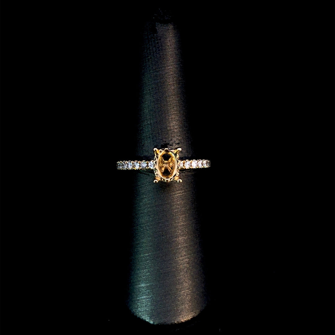 This elegant diamond semi-mount showcases a hidden halo that adds subtle, refined detail around your chosen oval center stone. Extra diamonds along the 14kt yellow gold band enhance the overall sparkle for a total carat weight of 0.40ctw. Select your perfect center stone from our exclusive collection of loose stones to create a personalized and stunning engagement ring. Price is for the semi mount only. Center stone will be added at an additional cost. This ring is a size 7. If that size is not a perfect fit, first time sizing is free at the time of purchase. Additional sizing fees may apply.