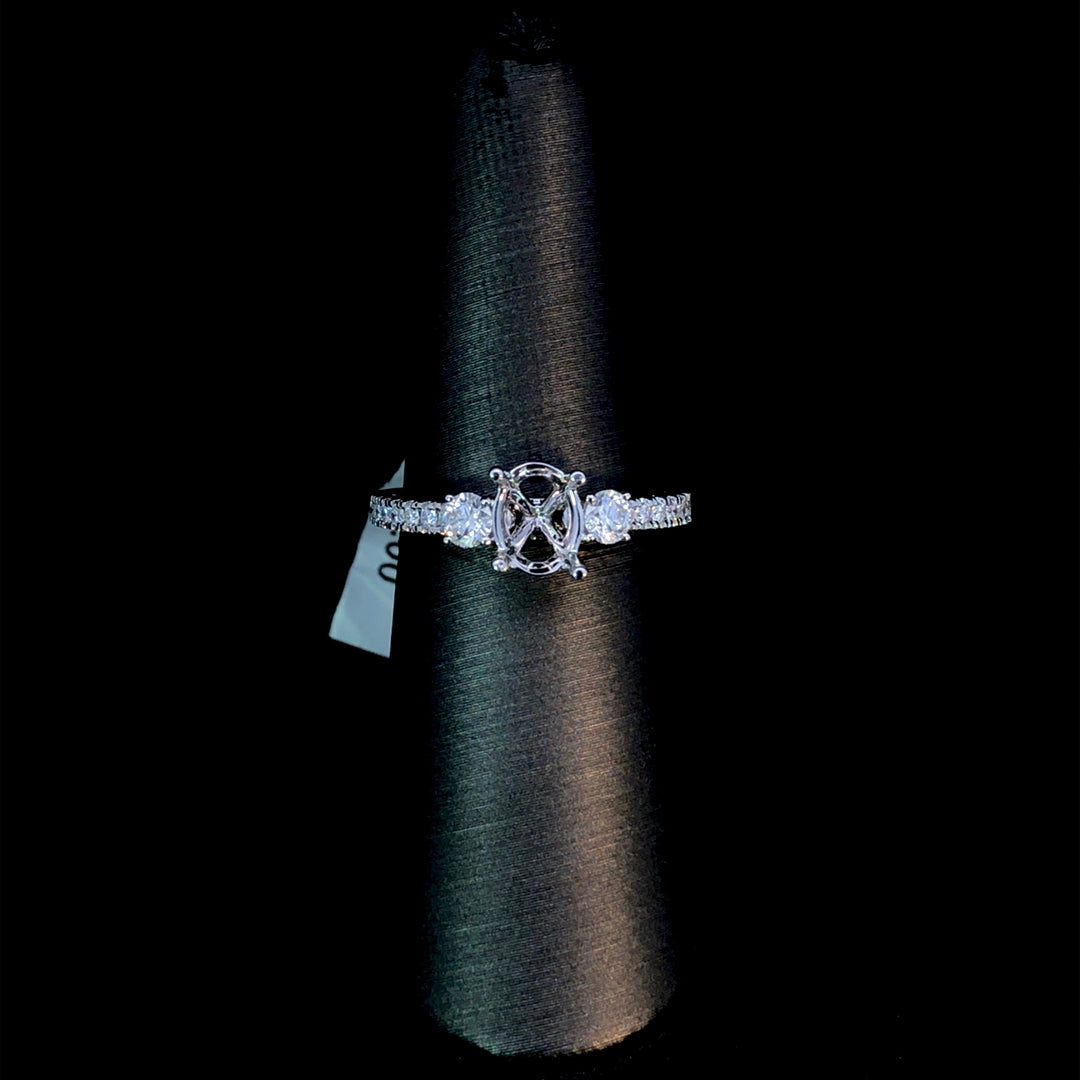 This beautiful diamond semi-mount showcases a classic three-stone design with 0.52ctw of round diamonds set in 14kt white gold. A decorative detail beneath the setting adds a unique touch of elegance. Personalize this stunning piece by selecting your preferred center stone from our extensive collection of loose diamonds to create a ring that’s truly your own. Price is for the semi mount only. Center stone will be added at an additional cost. This ring is a size 6.75. If that size is not a perfect fit, first time sizing is free at the time of purchase. Additional sizing fees may apply.