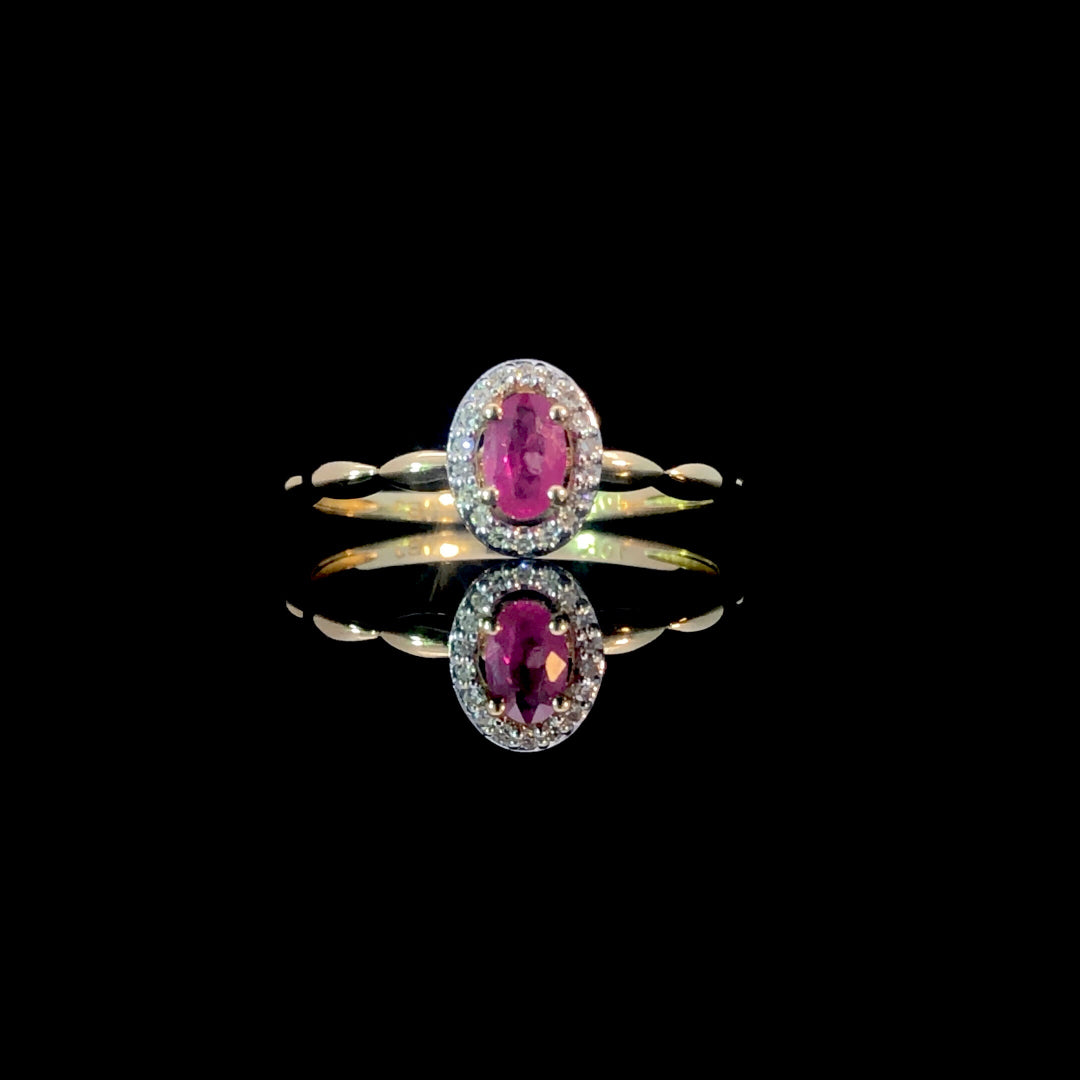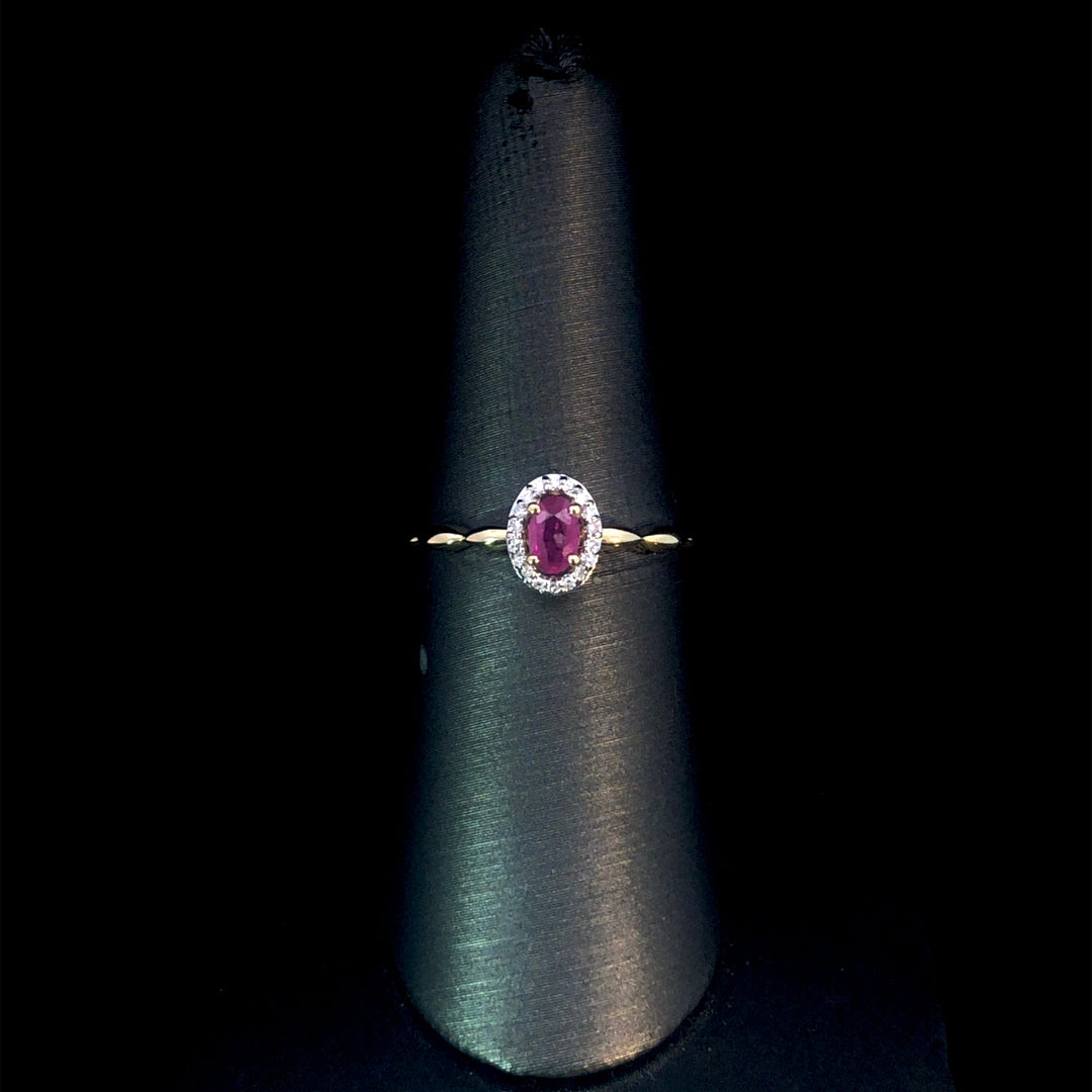 This stylish ring highlights a vibrant oval ruby at its center, encircled by a delicate halo of diamonds totaling .05 ctw. Crafted on a 10kt yellow gold bubble band, it offers a comfortable fit and a modern look, making it a perfect choice to brighten your everyday style. This ring is a size 7. If that size is not a perfect fit, first time sizing is free at the time of purchase. Additional sizing fees may apply.