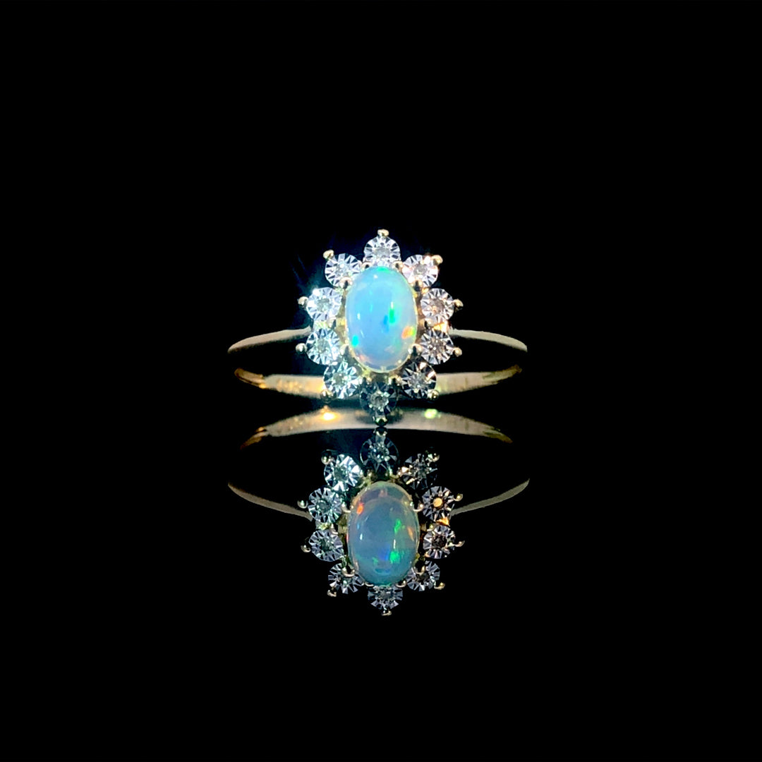 This ring highlights a beautiful oval opal at its center, framed by a delicate halo of .03ctw of round diamonds set in an illusion style. The smooth 10kt yellow gold band adds warmth and elegance, making this piece a timeless addition to any jewelry collection. This ring is a size 7. If that size is not a perfect fit, first time sizing is free at the time of purchase. Additional sizing fees may apply.